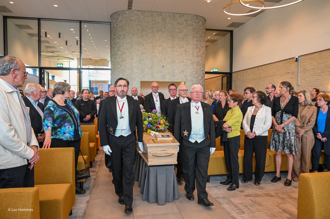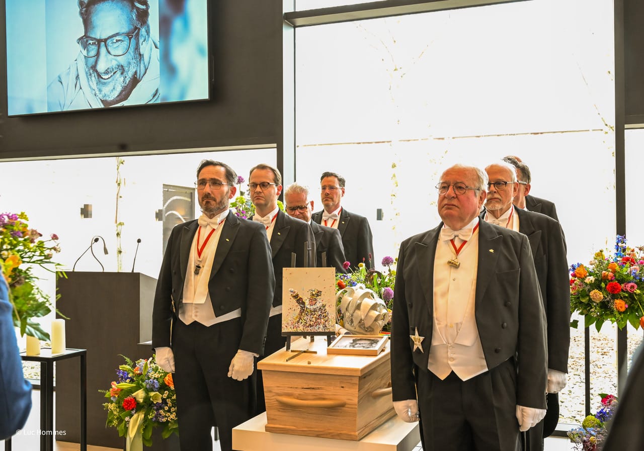 Op zijn kist lagen zijn prinsenkap en zijn prinsensjerp. Diverse oud-prinsen en Tempeleers namen afscheid van Slakhorst. Ook waren er veel horecaondernemers in de Grande Suisse.