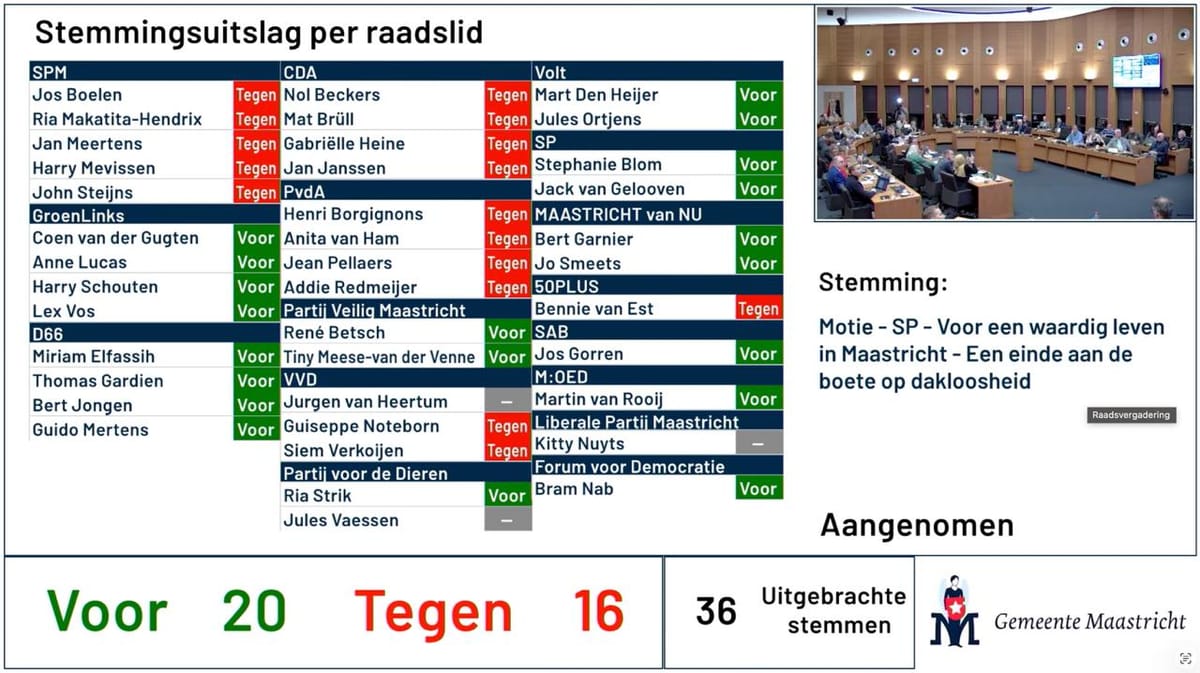 Met twintig tegen zestien stemmen nam de gemeenteraad van Maastricht deze week een SP-motie aan om de 'boete op dakloosheid' te schrappen uit de APV. PvdA-raadslid Addie Redmeijer komt nu met een keiharde waarschuwing: de stad heeft de deur open gezet voor daklozen uit België en Duitsland. "Wees welkom in Maastricht. Want daar krijg je geen boete."
