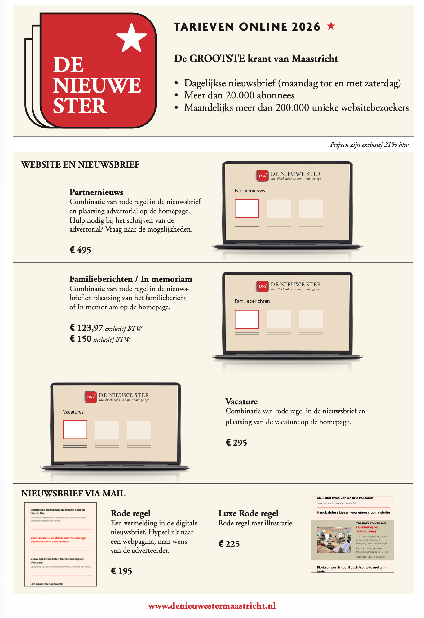 Elk afscheid verdient aandacht en warmte. Met een overlijdensbericht in De Nieuwe Ster bereikt u heel Maastricht. Door een bericht te plaatsen, geeft u nabestaanden, vrienden en kennissen de gelegenheid om samen te rouwen en te herinneren. Voor slechts 150 euro inclusief btw wordt uw overlijdensbericht niet alleen opgenomen op