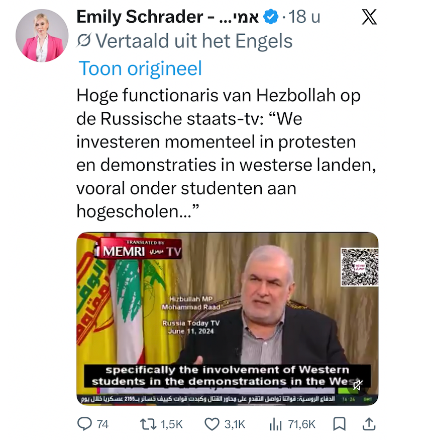 Het is opmerkelijk dat de AIVD de betrokkenheid van het door Iran gefinancierde Hamas bij de protesten nu pas zo duidelijk aangeeft in een jaarverslag. Organisaties als Hamas en ook het eveneens door Iran gefinancierde Hezbollah in Libanon maken er op social media geen enkel geheim van wat hun agenda en hun strategie is. Hieronder slechts een van de vele voorbeelden: