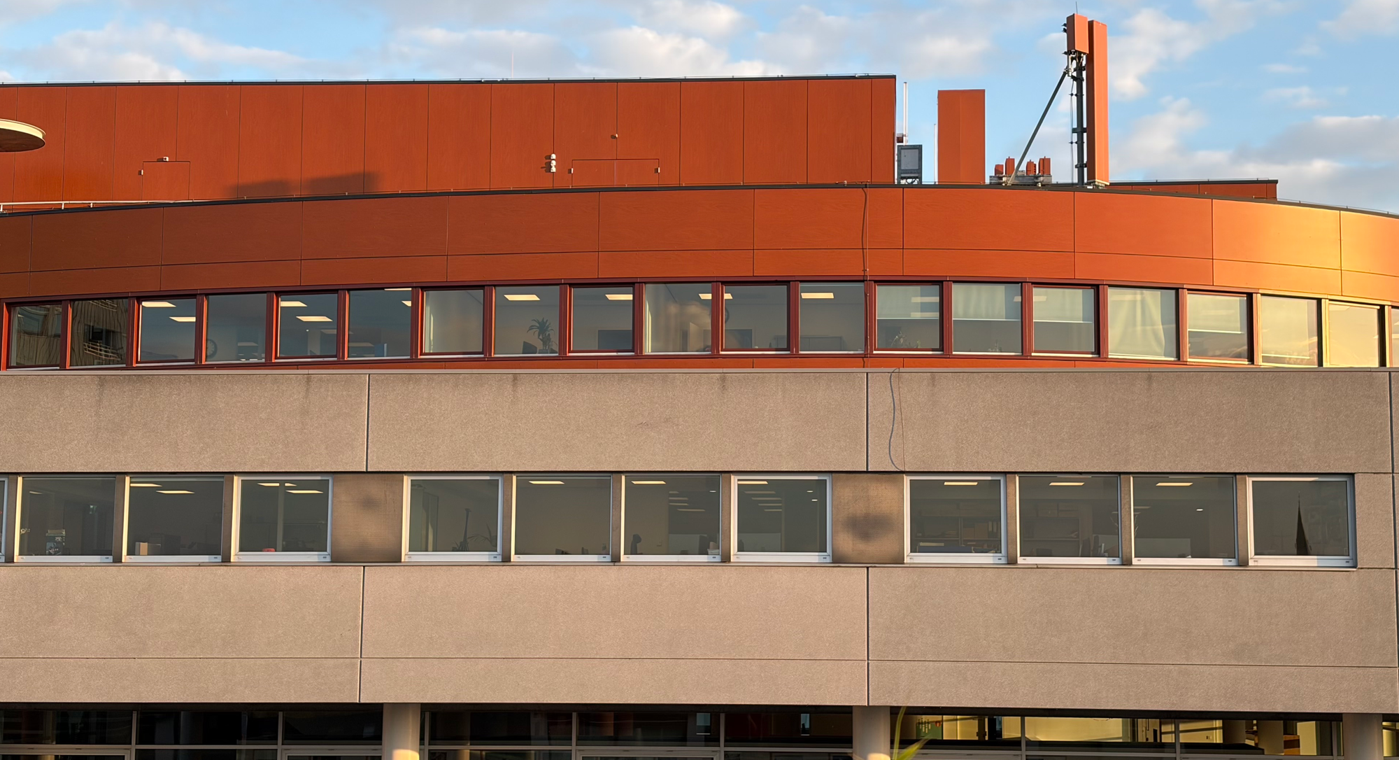 Wie denkt dat het licht na sluitingstijd op de bovenste etages uitgaat heeft het mis. Tot 20.00 uur blijven de bovenste kantooretages baden in het overvloedige licht, ook als het buiten niet meer donker is zoals nu in het voorjaar.