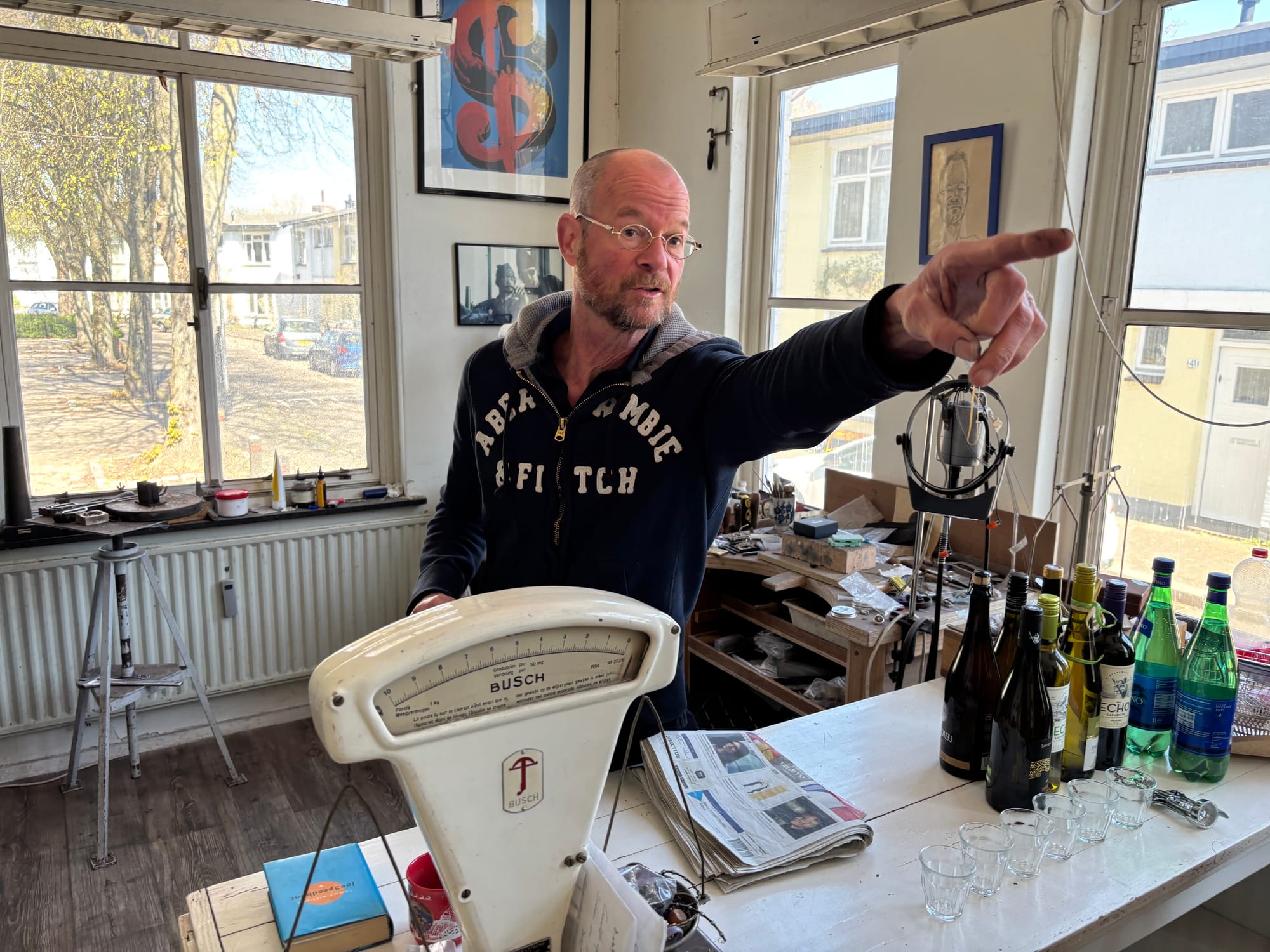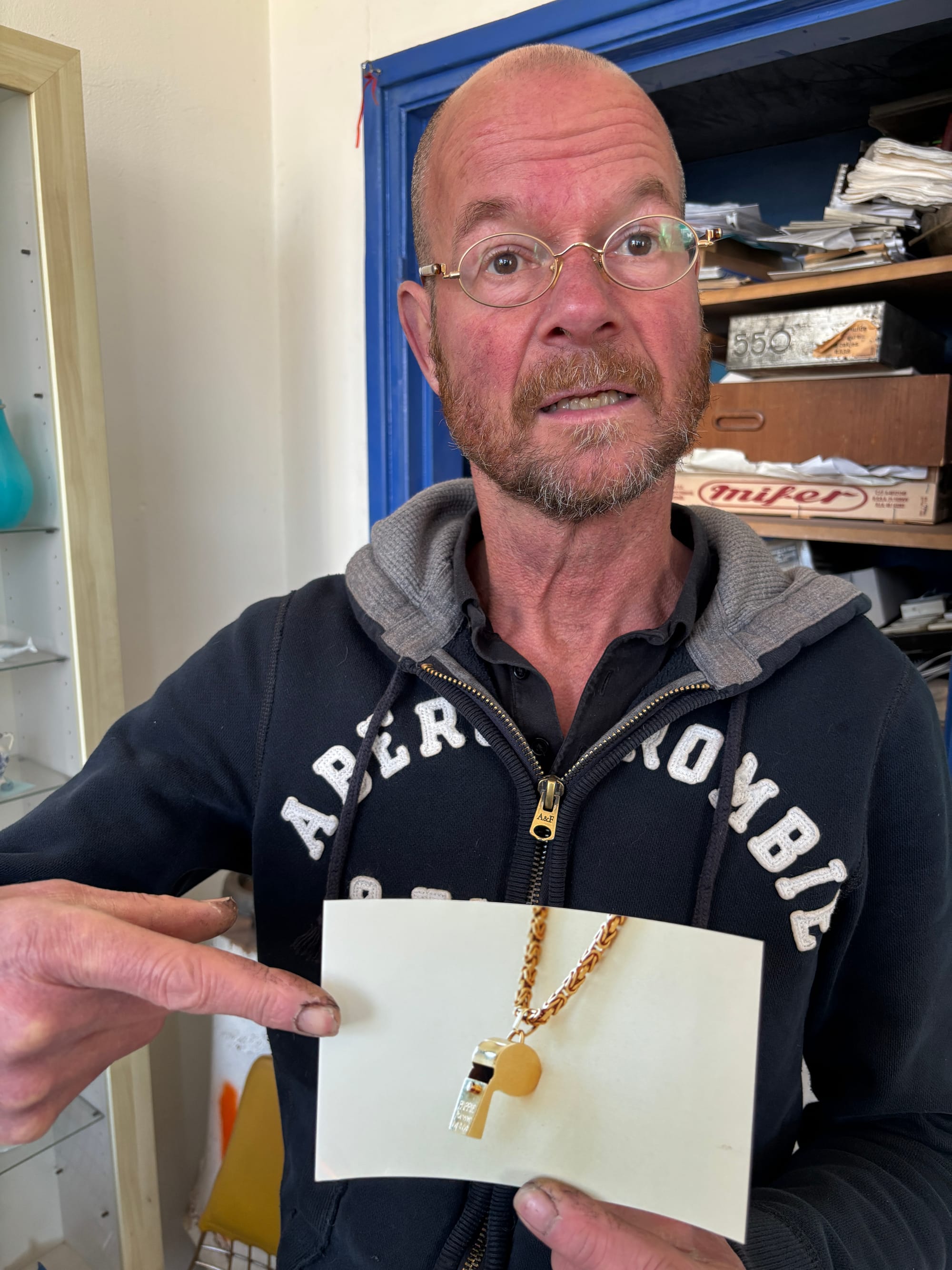 Delcourt is een spraakwaterval. "Ik denk dat mijn spectrum begint met de letter A." Op de toonbank liggen de dikke zaterdageditie van het NRC en de Groene Amsterdammer. De weegschaal is symbolisch voor zijn sterrenbeeld. Delcourt komt uit Maastricht, studeerde er aan de Kunstacademie. Hij werkt niet alleen met edelmetalen, hij heeft ook gouden handjes, zo blijkt als hij een klapper laat zien met foto's van gemaakt werk. Alles blijkt mogelijk. "Iemand wilde een 18-karaats gouden scheidsrechtersfluitje hebben. Dus dat heb ik gemaakt, compleet met trilballetje. Het was best nog wat werk om de luchtstroom goed te krijgen. Voor een bekende scheidsrechter? Nee, nee. Iemand wilde dat gouden fluitje hebben voor in de kroeg."