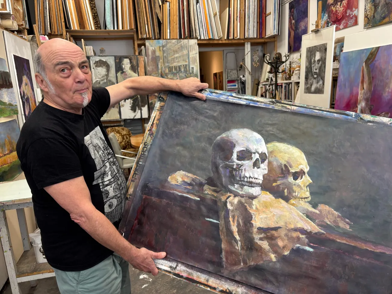 Enkele deuren verder zit schilder Ton Franssen uit Vaals. Ook al iemand die de gepensioneerde leeftijd heeft bereikt. Hij noemt zichzelf een "symbolist". Hij werkt met symbolen - vaak dode vogels - die als kapstok dienen voor de kijker. Die kan aan de hand van de symboliek in een schilderij zijn eigen verhaal in zijn hoofd maken. "Ik ben een verhalende kunstenaar. Ik voel me thuis bij de Jonge Italianen, meer dan bij de Deutsche Wilden." Voor wie wil weten hoe dat precies zit: zijn deur staat altijd open, ook na het open atelierweekend.