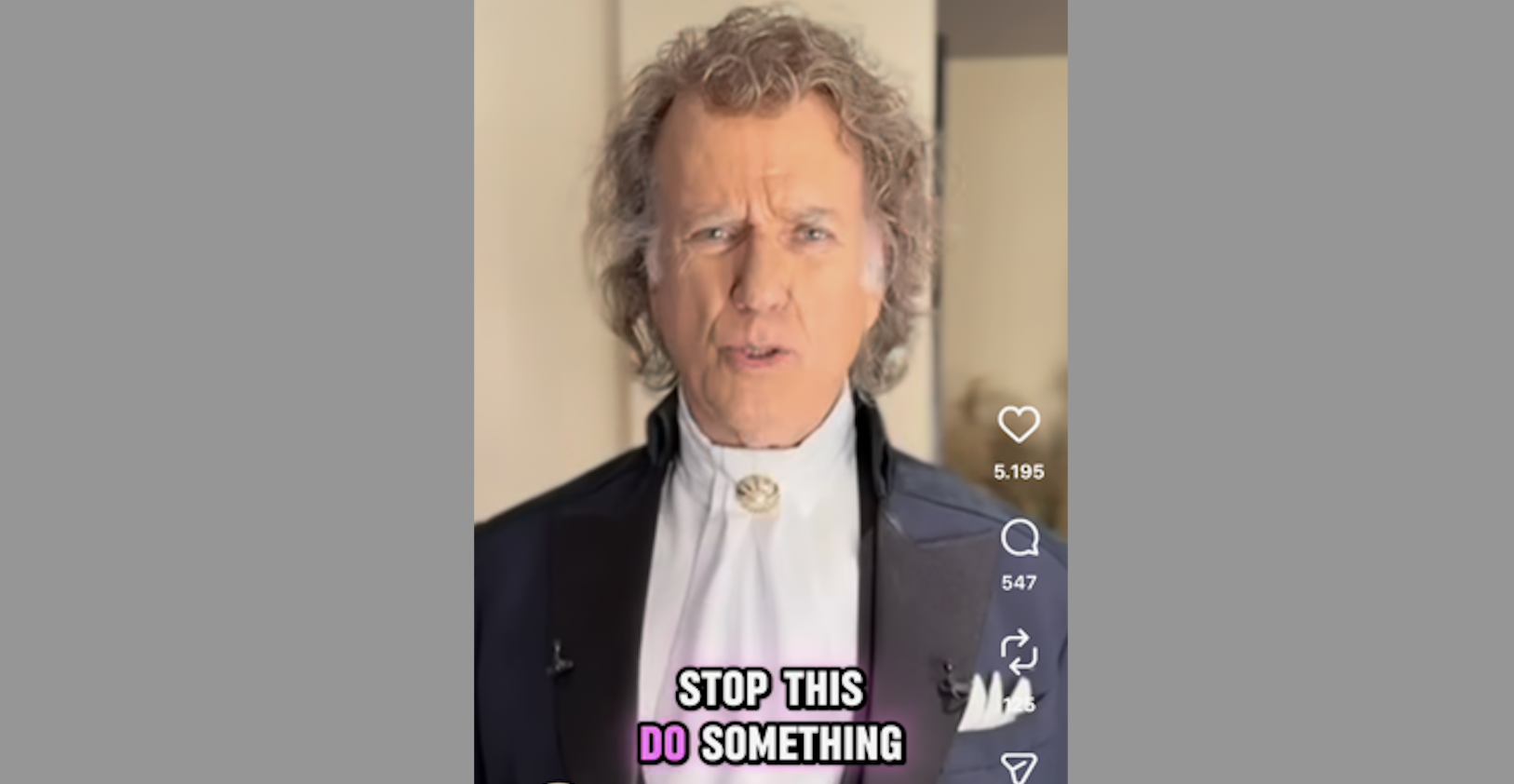 In een post op Instagram zien we eerst zoon Pierre Rieu die verkleed is als André en zegt 'Hi everyone, André here'. Op humoristische wijze brengt hij het probleem onder de aandacht om vervolgens te vertellen dat er heel veel nepberichten verschijnen. "Nee, mijn vader ligt niet in het ziekenhuis, zijn hond is niet dood, mijn hond leeft nog, mijn moeder stierf niet in een auto-ongeluk, André is niet op het podium ingestort en hij is niet van geslacht veranderd." Allemaal fakeberichten, maar soms kunnen fans niet onderscheiden wat echt en wat nep is. Daarom het dringend beroep aan Facebook om de oplichters aan te pakken.