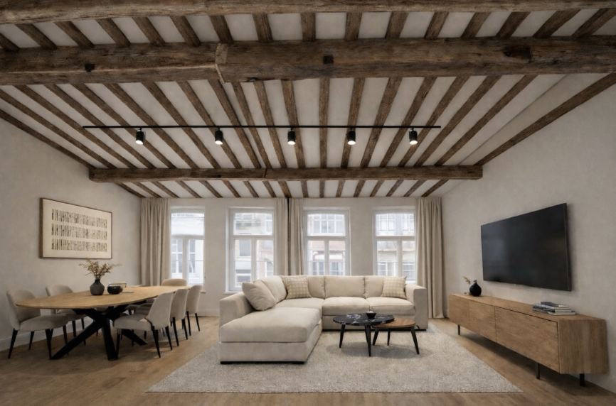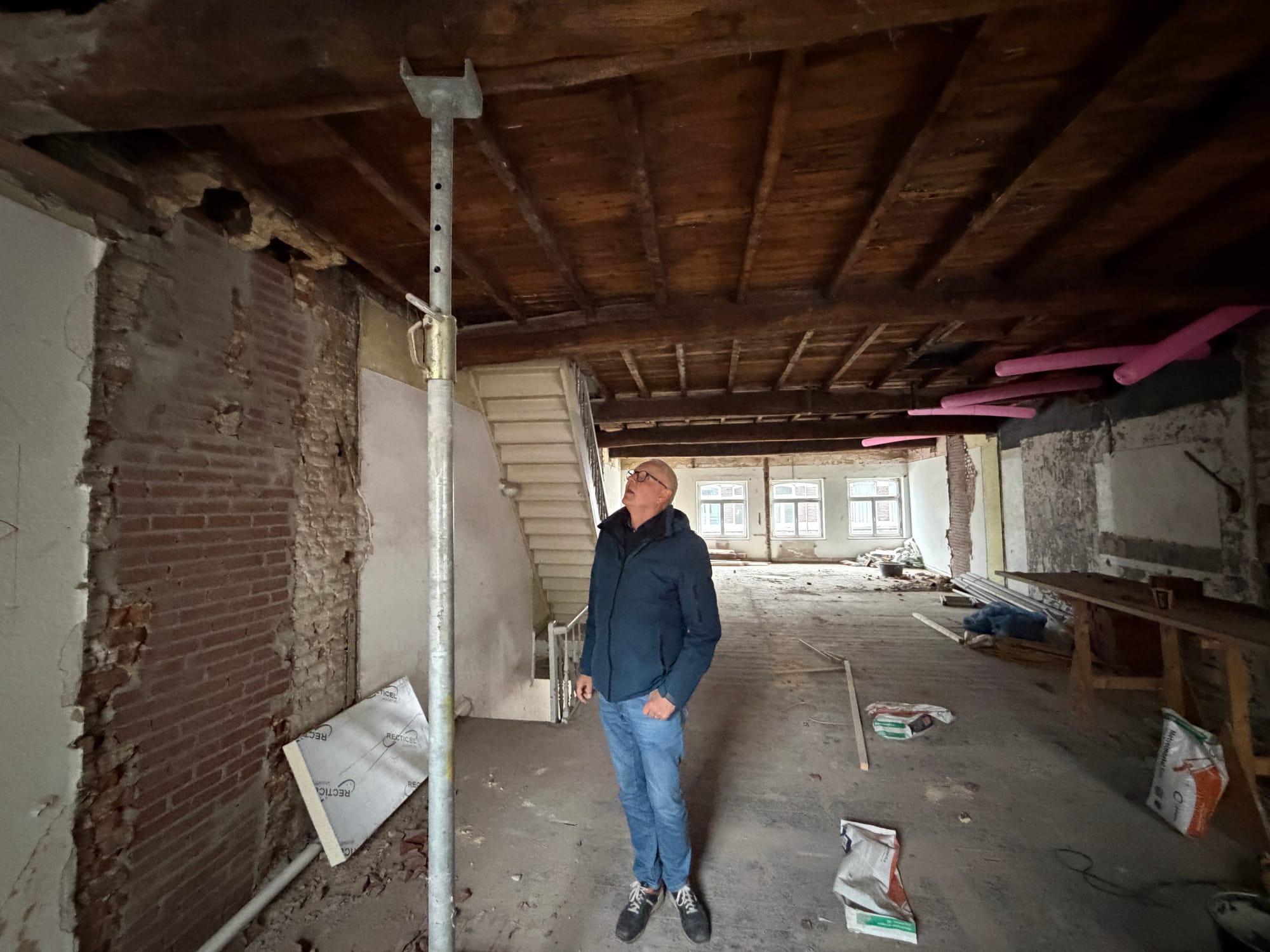 Schilderman: "Die nieuwe vloer wilden we zeg maar een of twee millimeter boven de dikke houten draagbalken aanbrengen, zwevend dus. Dat heeft drie grote voordelen: een stabiele vloer die geen geluid naar boven of beneden doorgeeft, het is constructief beter en we kunnen alle houten balken in het zicht laten. Balken die dan vrij hangen, waardoor ze niet meer belast worden en er weer eeuwen tegen kunnen."