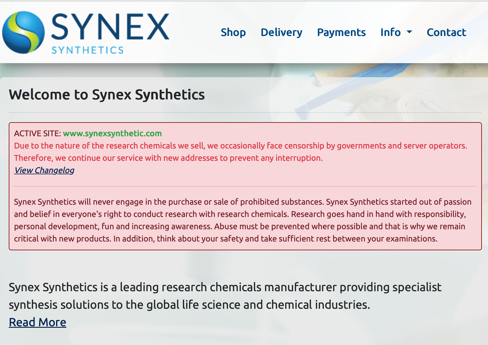Syntex laat op de site weten dat ze regelmatig met autoriteiten in de clinch ligt. "Vanwege de aard van de onderzoekschemicaliën die we verkopen, worden we af en toe geconfronteerd met censuur door overheden en serveroperators. Daarom zetten we onze service voort met nieuwe adressen om onderbrekingen te voorkomen. Synex Synthetics zal nooit verboden stoffen kopen of verkopen. Synex Synthetics is ontstaan uit passie en geloof in ieders recht om onderzoek te doen met onderzoekschemicaliën."