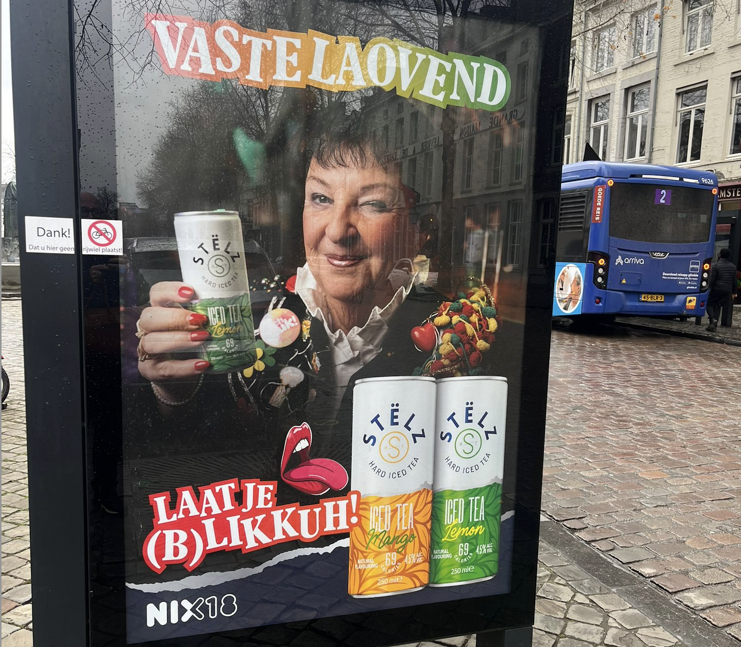 We moesten even twee keer kijken. Staat het er nu echt? De carnavalsreclame van een of ander goor drankje in de bushokjes in Maastricht is ronduit smakeloos. Want wat zien we? Onze Beppie die een blikje Stëlz in de hand houdt en daar onder de tekst Laat je (B)Likkuh! En daarbij een grote rode tong. Laat je likken dus.... en dan ook nog op het blikje zetten dat er 69 calorieën inzitten. Man, man, man. Ongetwijfeld bedacht door een Hollander die carnaval associeert met drank en sex. Ga je schamen!