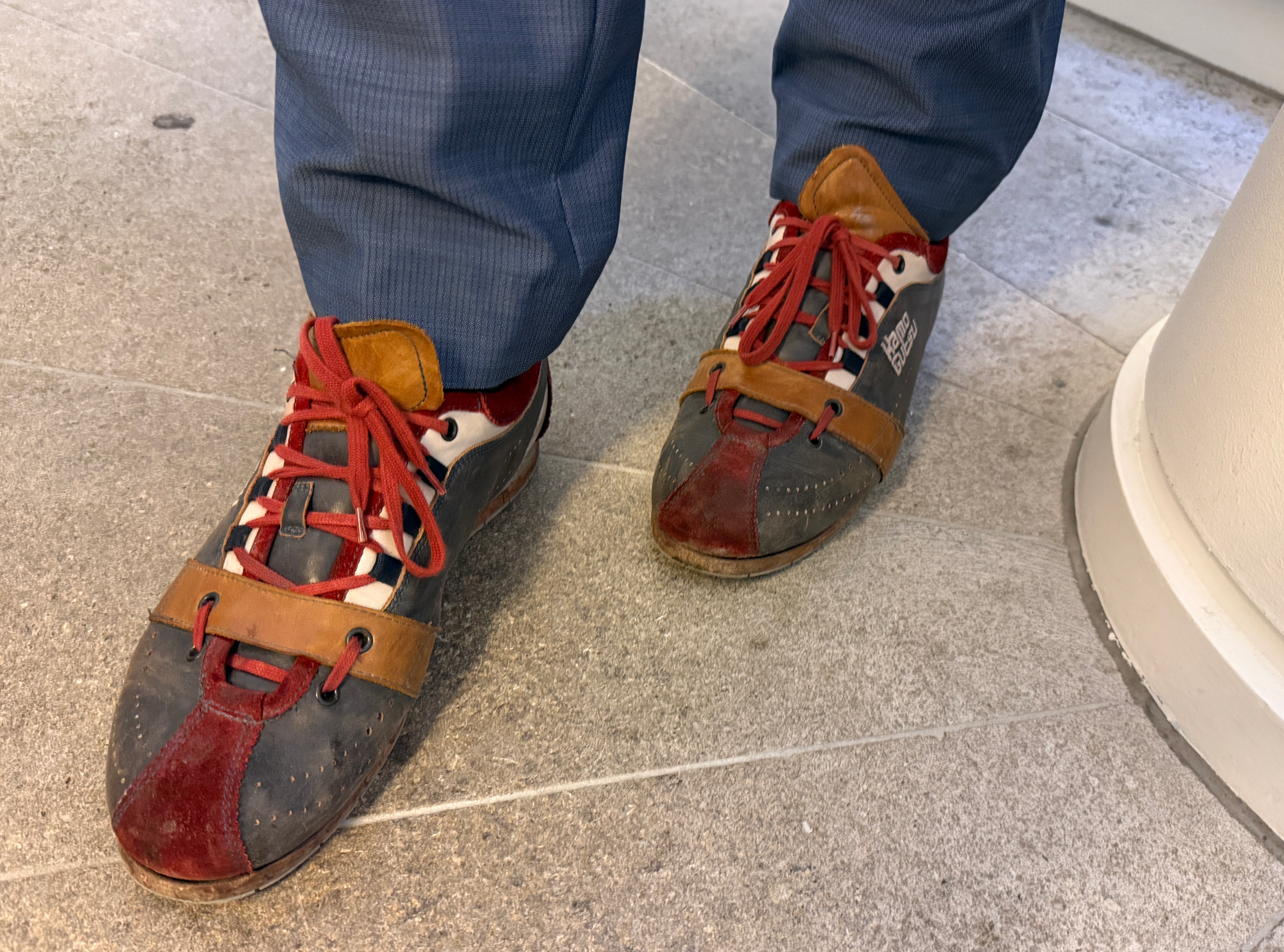 Wie draagt deze sneakers onder een blauw pak? Een tip: de schoenen zijn van het Belgische merk Kamo Gutsu. Van de erotiekbeurs Kama Sutra hadden we via een vriend wel eens gehoord, maar nog niet van Kamo Gutsu.