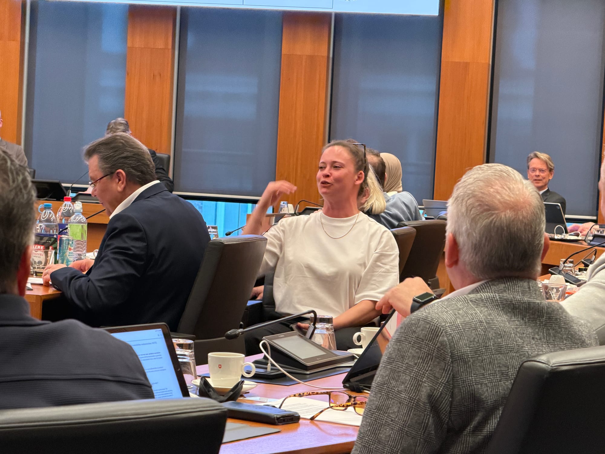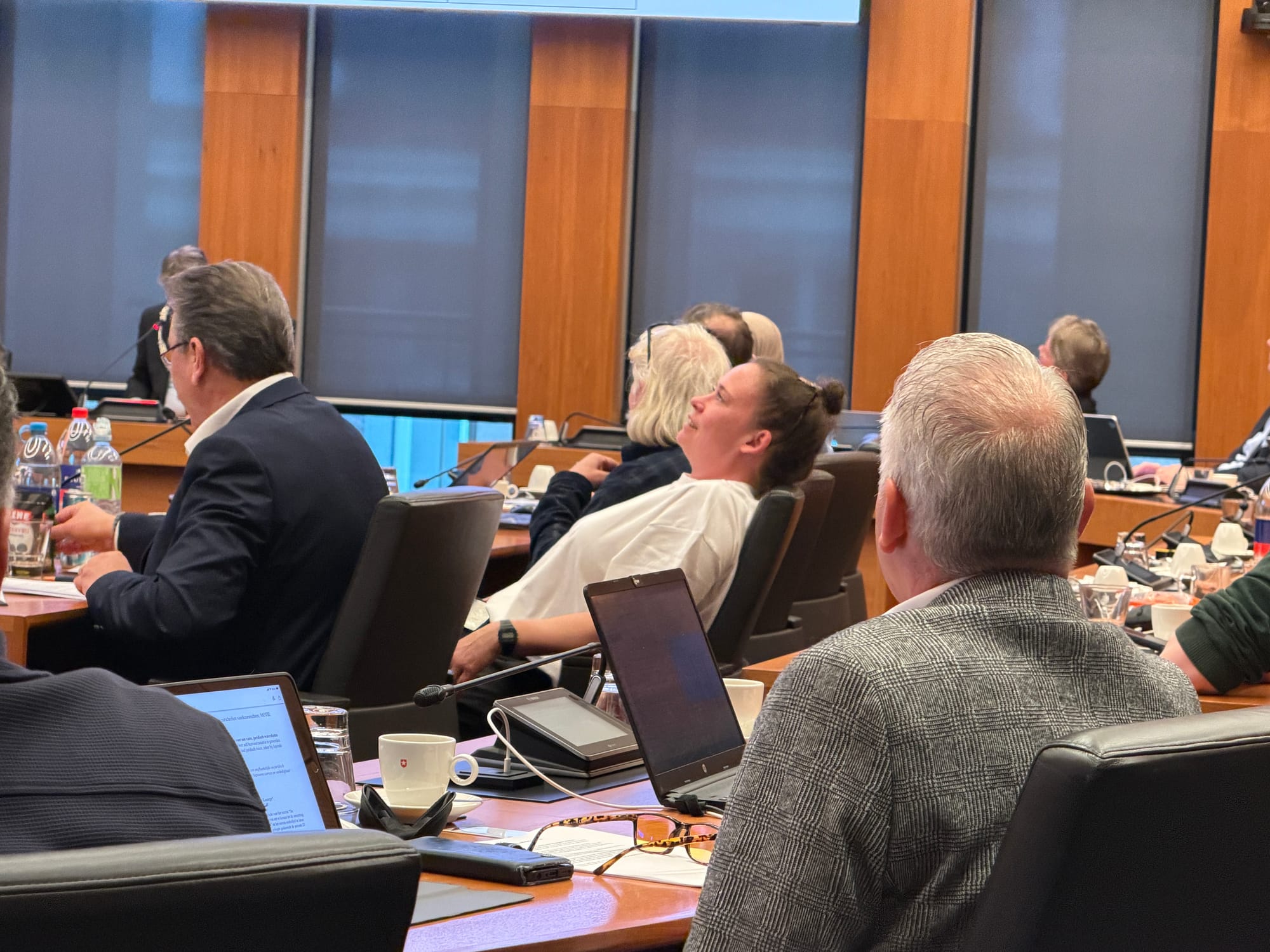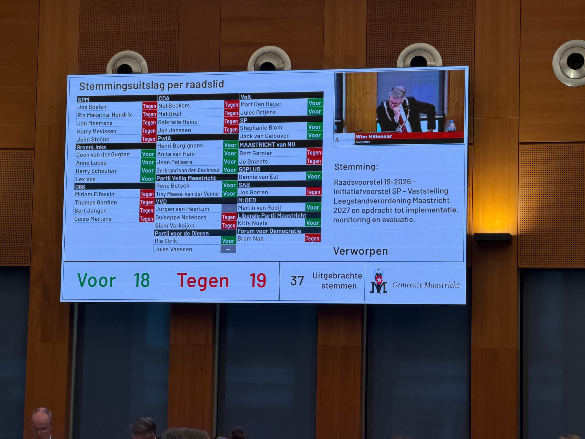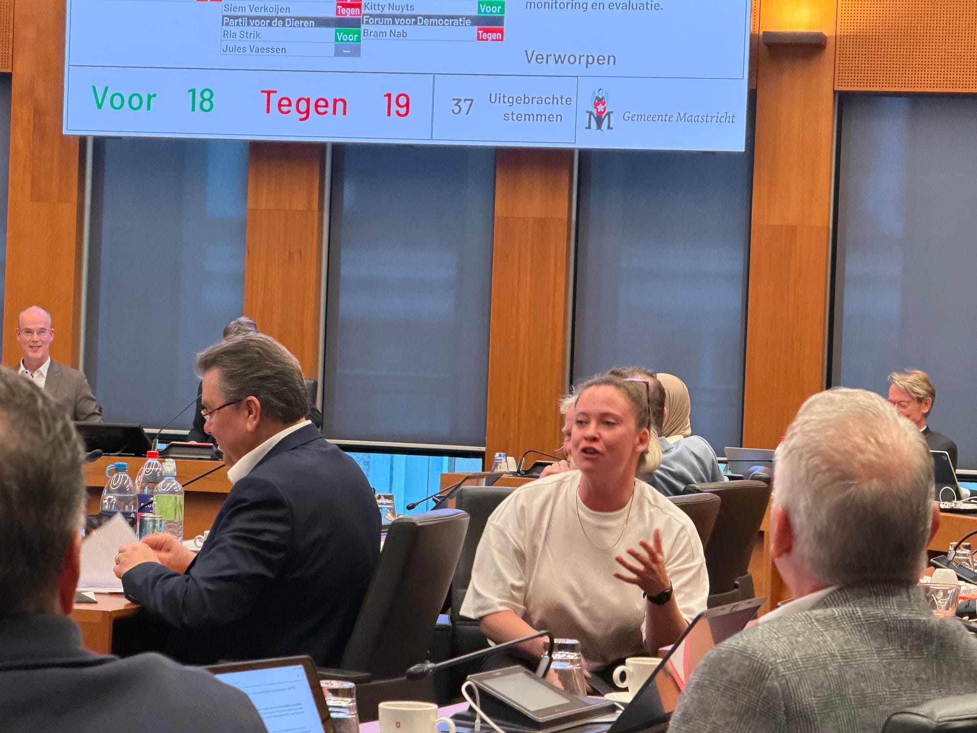 Jaren knokken voor de Leegstandsverordening en dan met 18-19 de stemming voor het initiatiefvoorstel verliezen. Blom is teleurgesteld en spreekt haar directe buurman Jos Gorren van SAB aan, die tegen stemde.