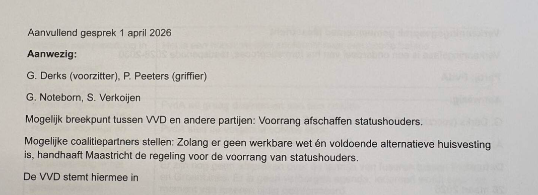 Derks schrijft: "Mogelijke coalitiepartners stellen: Zolang er geen werkbare wet én voldoende alternatieve huisvesting is, handhaaft Maastricht de regeling voor de voorrang van statushouders."