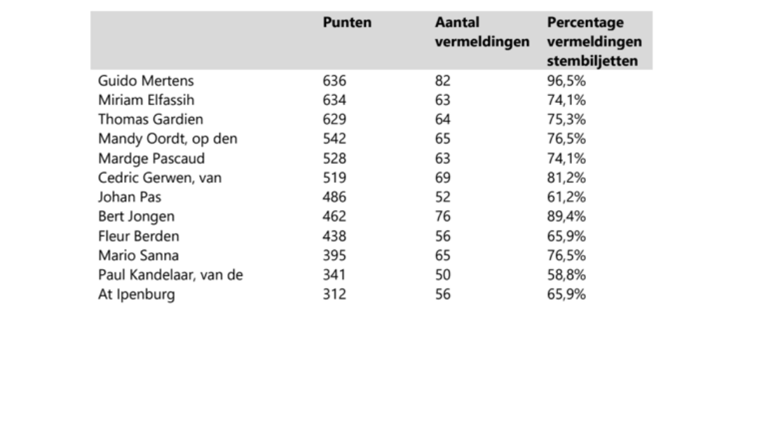 Tegenvaller ook voor nieuwkomer Mardge Pascaud, stond op vier en staat nu op plek zes. Oudgediende Bert Jongen maakt een sprongetje vooruit. Staat nu op plek 9 en dat was 11.
