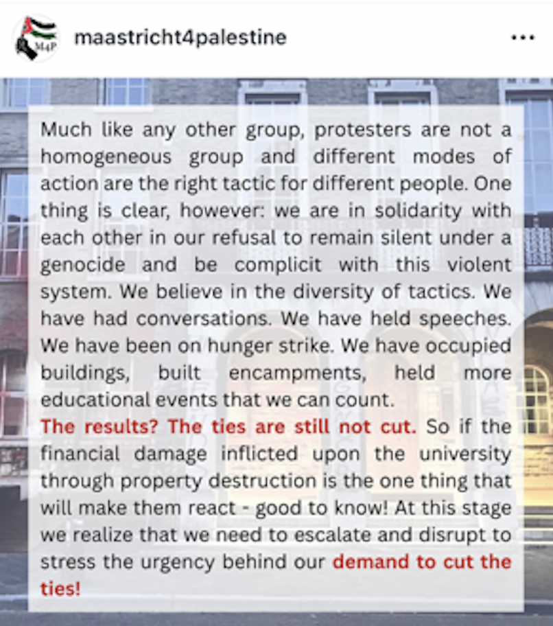 In een verklaring die ook op Maastricht4Palestine staat, is meer te lezen over de motivatie van de bekladding van het gebouw van de universiteit. De actievoerders kondigen aan dat ze doorgaan met hun acties en deze zullen intensiveren zolang de universiteit de banden met Israëlische universiteiten en onderwijsinstellingen niet verbreekt.