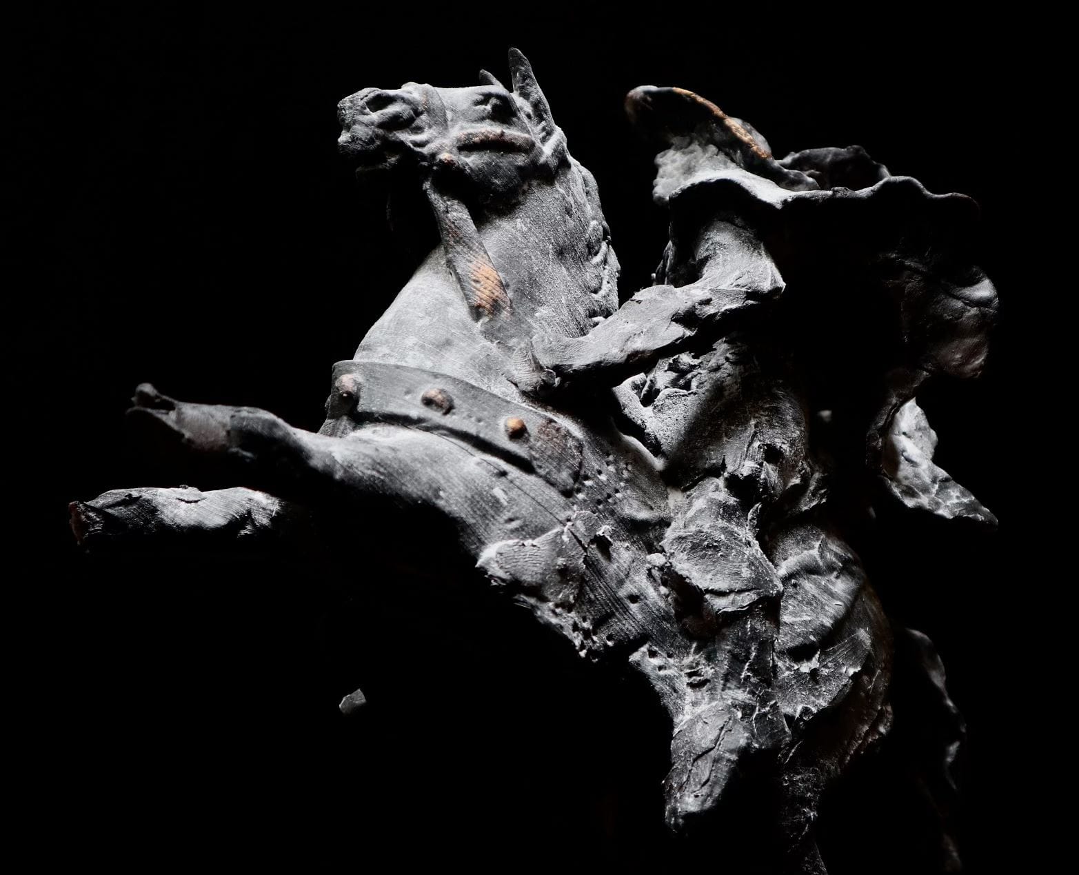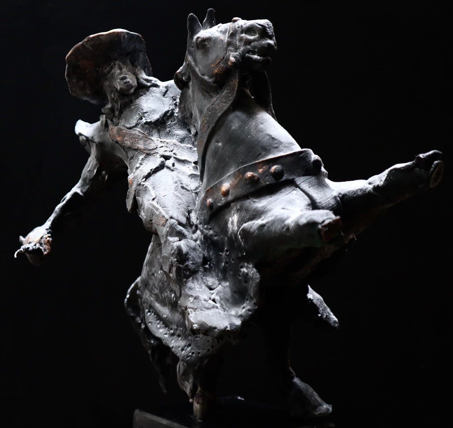 Wil van der Laan: "D'Artagnan voor de kerk waar zijn skelet is gevonden. We gaan ervan uit dat het klopt, mooier kan het immers niet en dat houden we vooral zo! Voor mij reden genoeg om een wasmodel voor een brons van D'Artagnan te maken, in dit geval 28cm breed en 28cm hoog. D'Artagnan te paard, het moest een van der Laan brons worden. Dat wil zeggen: snel, met toetsen impressionistisch geboetseerd zodat het licht zorgt voor een gevarieerd, beweeglijk en continu veranderend brons. Dus geen statisch knap uitgewerkt beeld, die stijl behoort toe aan anderen, dat wilde ik per se niet. Daar heb ik ook geen geduld voor. Het is niet onwaarschijnlijk dat er straks een grotere versie van ongeveer 80cm komt, daar is door een klant naar geïnformeerd, zou mooi zijn."