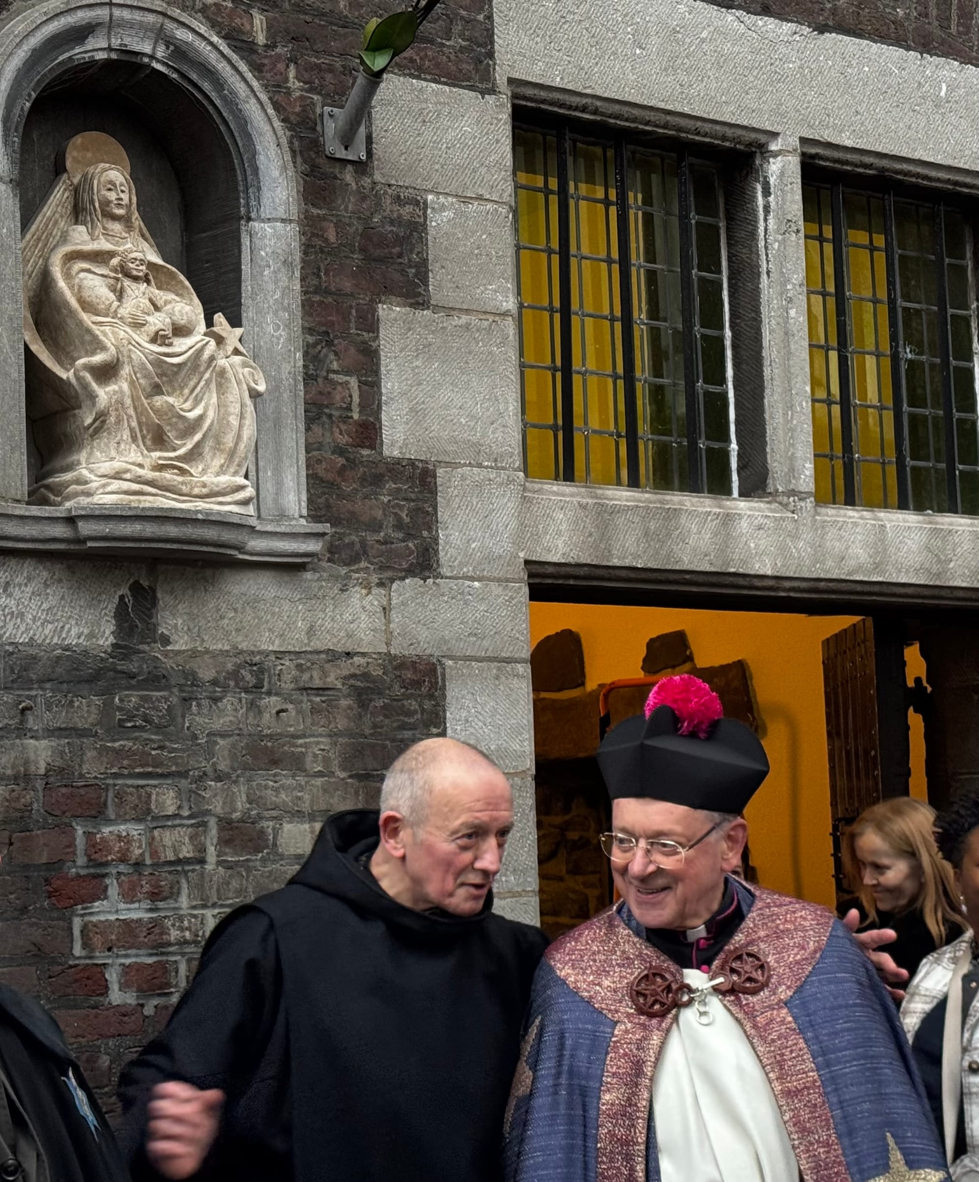 En in de vroege avond van woensdag 25 maart 2026, op het feest van Maria Boodschap, trekken de leden broederschap van Onze-Lieve-Vrouw, priesters en religieuzen, gelovigen – oud en jong – van de Onze-Lieve-Vrouwebasiliek naar de Toneelacademie op de hoek van de Lenculenstraat. Daar is het door frater Leo Disch vervaardigde nieuwe beeld in de al zo lange tijd verlaten nis gezet, aan het zicht onttrokken door een tulen doek. ‘Dit beeld,’ zegt pastoor Vries voordat hij het beeld aldaar onthult, zegent en bewierookt, ‘completeert de aloude Bidweg van Onze Lieve Vrouw. Heel zinvol staat het beeld van de “Zetel der Wijsheid”, waarmee wordt verbeeld dat Maria verbonden is met de eeuwige Wijsheid van God, in de nis bij de Toneelacademie. Want vanouds wordt deze beeltenis van Maria vooral gebruikt door instellingen van hoger onderwijs.’ Tijdens het samenzijn passeren voetgangers, vervolgen fietsers hun weg en maakt de stadsbus maakte voorzichtig zijn draai vanuit de Bouillonstraat.