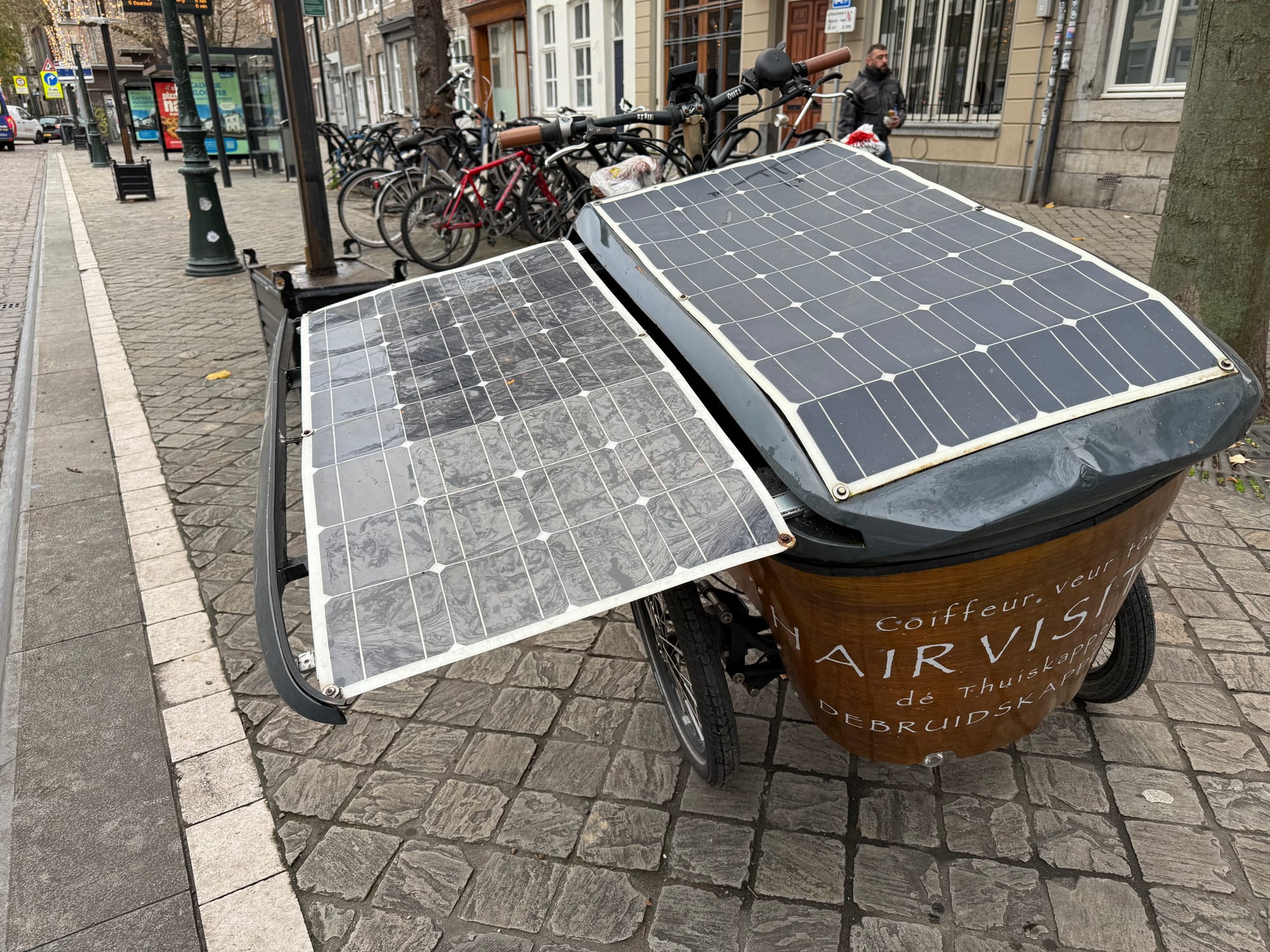 Toen in 2017 het project Maastricht Bereikbaar werd opgestart, waarbij ondernemers onder meer een subsidie konden krijgen bij de aanschaf van een elektrische bakfiets was hij gelijk geïnteresseerd. “Met een elektrische bakfiets had ik de auto niet meer nodig. In de bak kan ik al mijn spullen kwijt. Ik heb vervolgens zelf een deksel gemaakt voor op de bak. Dat was overigens nog niet eenvoudig, omdat de bak ronde vormen heeft. Ik had wel al ervaring om met polyester te werken bij het repareren van een kano. Uiteindelijk is het me gelukt. Toen ik de oppervlakte van het deksel zag, dacht ik ‘als daar nu eens zonnepanelen op kunnen’. Dat heb ik vervolgens ook gemaakt, maar de vooraf gemaakte berekening maakte duidelijk dat één paneel niet voldoende was om in mijn energiebehoefte te voorzien. Daarom heb ik ook nog uitschuifbare zonnepanelen gemaakt die onder de deksel zitten. Hierdoor kan ik van maart tot en met oktober de accu van de fiets gebruiken zonder te laden aan de stroom. Met een volle accu kan ik zo’n 250 kilometer afleggen en kan er ook nog eens mijn tondeuse tussentijds mee opladen.”