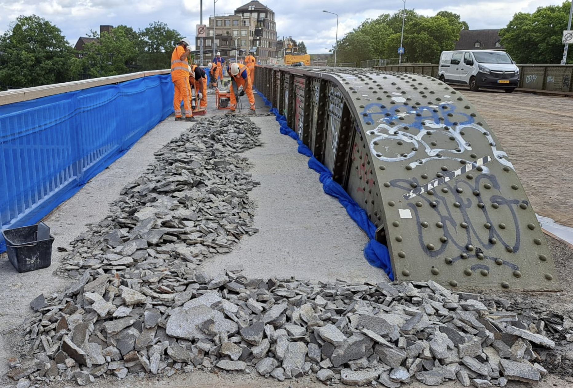 Vraag voor een pub-quiz? Hoeveel vierkante meter staal is verwerkt in de Wilhelminabrug? Het juiste antwoord is 1700 vierkante meter. Het staal is geïnspecteerd en is nog prima. Nog een weetje: het stalen deel is van Rijkswaterstaat, de betonnen deklaag is van de gemeente.