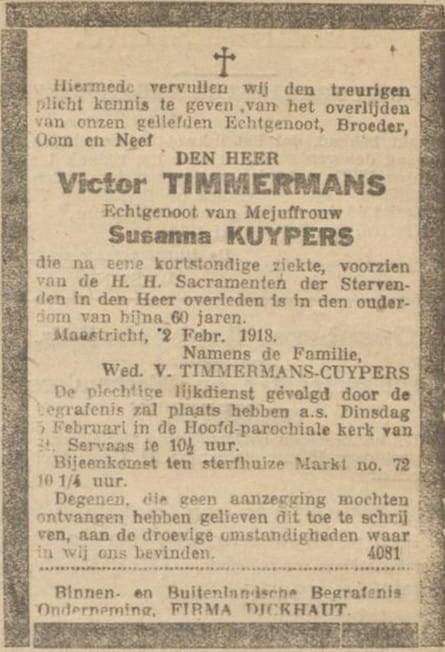 Het huwelijk van Victor en Susanna zou duren tot 2 februari 1918. Op die dag bezweek Victor aan de gevolgen van een hersenberoerte. Susanna bleef alleen achter in Het Haantje. Wanneer de aan het begin van dit verhaal genoemde Lambertus Mawhin Het Haantje overnam van Susanna Kuijpers heb ik niet kunnen ontdekken, maar dat zal in ieder geval ergens tussen 1919 en 1925 zijn geweest. Op 22 november 1919 werd in het Advertentieblad voor Limburg namelijk nog door de weduwe Timmermans reclame gemaakt voor het feit dat bij haar bier van Marres verkrijgbaar was. En vanaf 1925 verschenen advertenties van Lambertus Mawhin. De nieuwe kastelein ging er niet wonen met zijn gezin, want zoals we hiervoor konden lezen, bleef Susanna na de overname boven het café wonen. Pas na haar overlijden in 1930, toen de woning boven het café vrijkwam, zal de kasteleinsfamilie Mawhin er zijn gaan wonen.