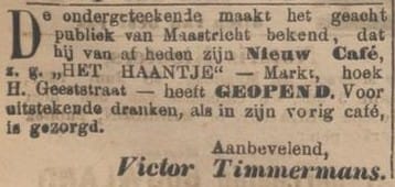 Op 22 en 29 mei van dat jaar 1897 liet de hiervoor genoemde Victor Timmermans een advertentie plaatsen in het Dagblad van Maastricht. Victor was op dat moment negenendertig jaar oud en kondigde aan dat hij een café, genaamd Het Haantje, had geopend. “Voor uitstekende dranken, als in zijn vorig café, is gezorgd”, zo is in de advertentie te lezen. Dat vorig café van Victor lag op de hoek van de Markt en de Nieuwstraat, waar tegenwoordig Café de Zwaan te vinden is (nummer 68).