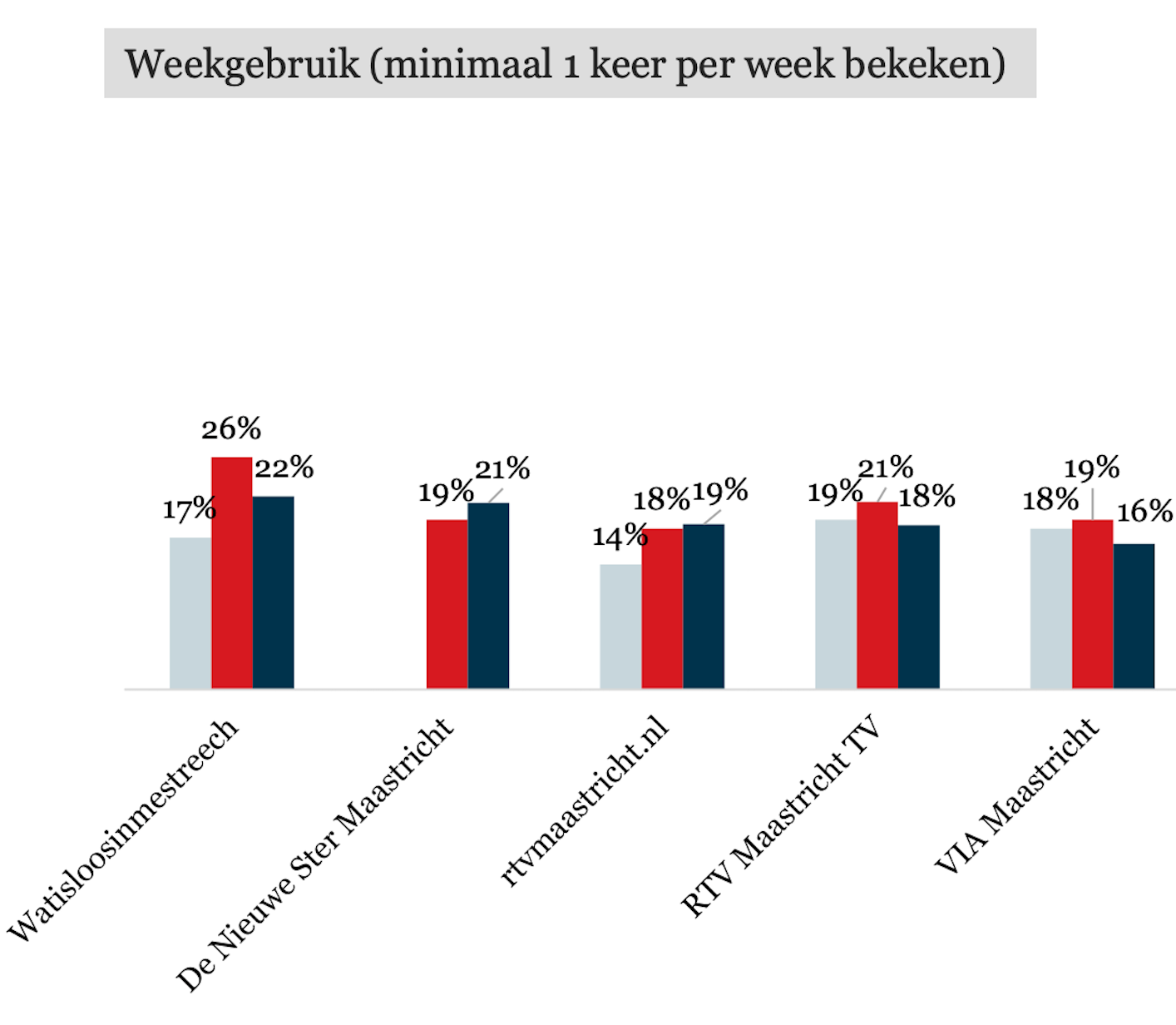 Gekeken naar het weekbereik scoren Wat is Loos in Mestreech (22%) en De Nieuwe Ster (21%) ongeveer even hoog. Wel valt op dat na een stijging bij Wat is Loos in 2024 (rode kolom) naar 26% het aandeel vorig jaar gezakt is naar 22%. De Nieuwe Ster, die twee jaar bestaat, laat een stijging zien van 19 naar 21 % in het weekgebruik.
