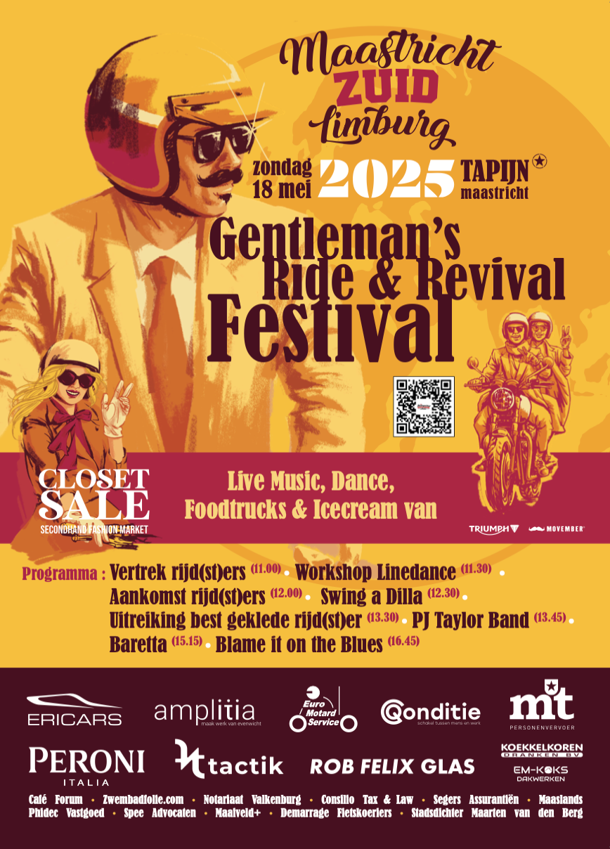 We rijden in stijl - Volgens de “Peaky Blinders” dresscode – en belonen de best geklede heer en dame. De rit van ongeveer 45 kilometer wordt begeleid door de Euromotards en voert in rustig tempo langs de mooiste wegen van Zuid-Limburg.Ná de rit bieden we een uitgebreid middagprogramma voor de Maastrichtse en Zuid-Limburgse toeschouwers en deelnemers: