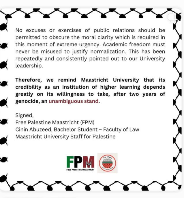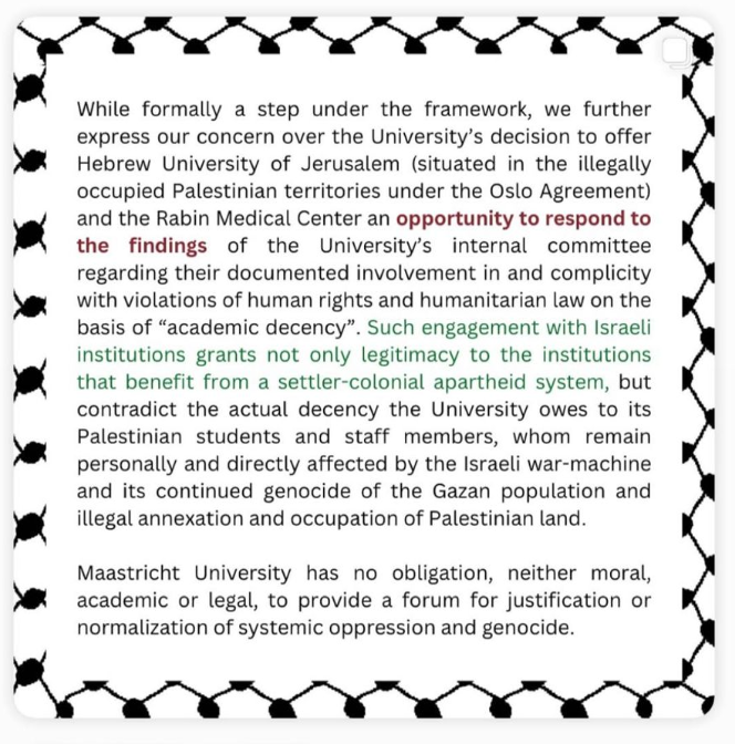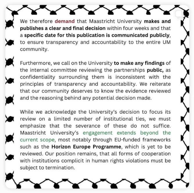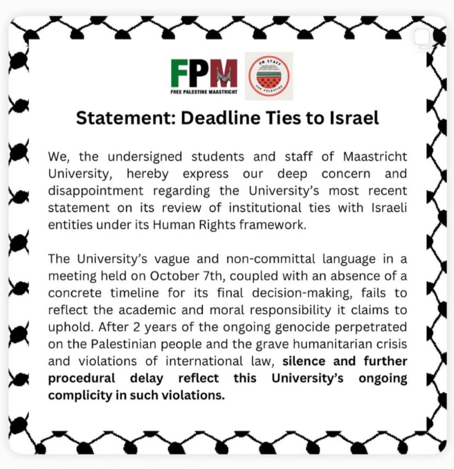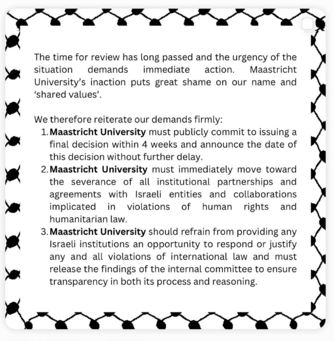 Een coalitie van Free Palestine Maastricht en de 'UM Staff for Gaza' heeft het bestuur van de Universiteit Maastricht (UM) een ultimatum gesteld. Binnen vier weken moet de UM publiek bekend maken of ze alle banden met Israëlische instellingen verbreekt of niet. De actievoerders reageren daarmee op uitlating van het bestuur gedaan op 7 oktober. Naar hun idee is daar alleen wollige taal gebruikt en wordt ook geen tijdpad genoemd wanneer de UM beslist wat ze gaat doen.