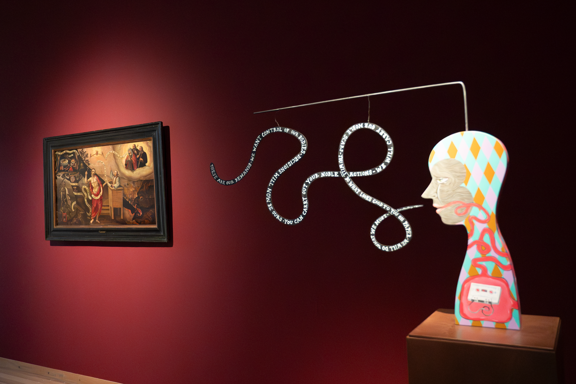“Het zijn deze contrasten, maar ook de overeenkomsten die mij fascineren”, zegt Mees. Iets verderop is een middeleeuws paneel te zien waar de banderol wordt gebruikt om het woord van God over te brengen. Dezelfde vorm van banderollen zien we terug in het kunstwerk van Ed Templeton: een jonge harlekijn spreekt zich uit voor het recht op abortus."