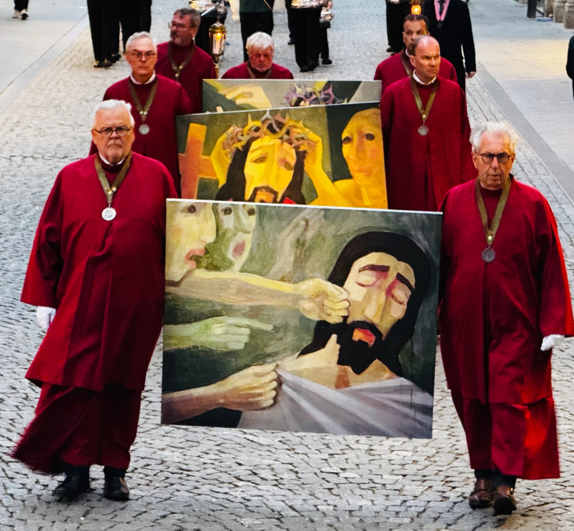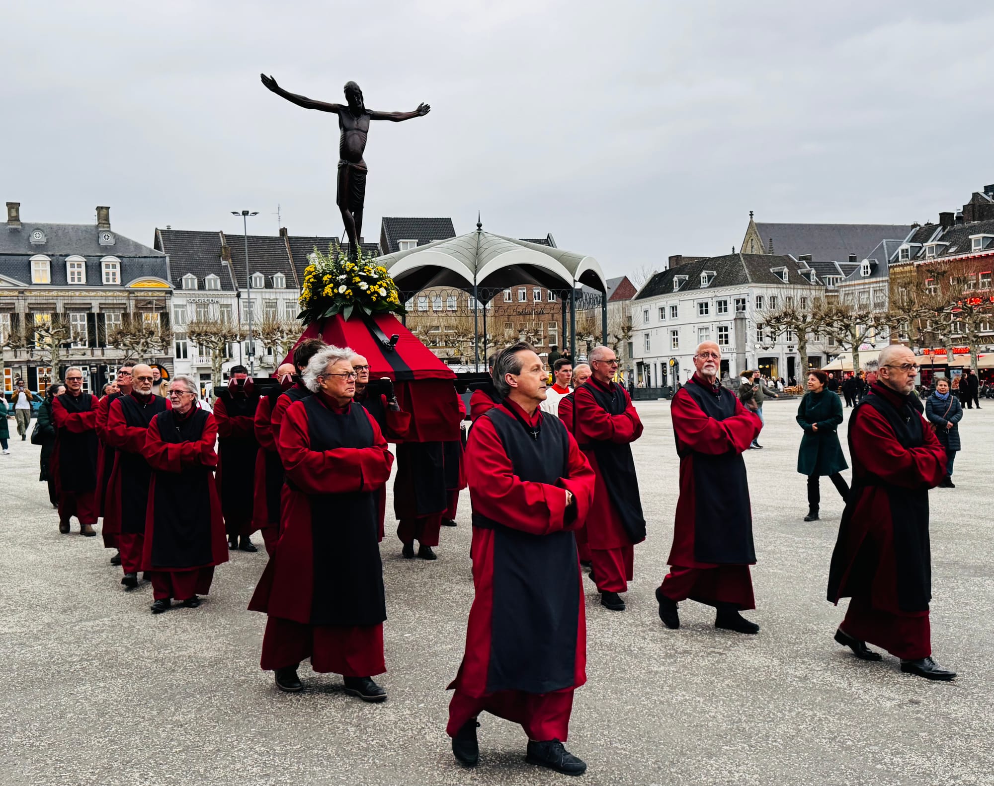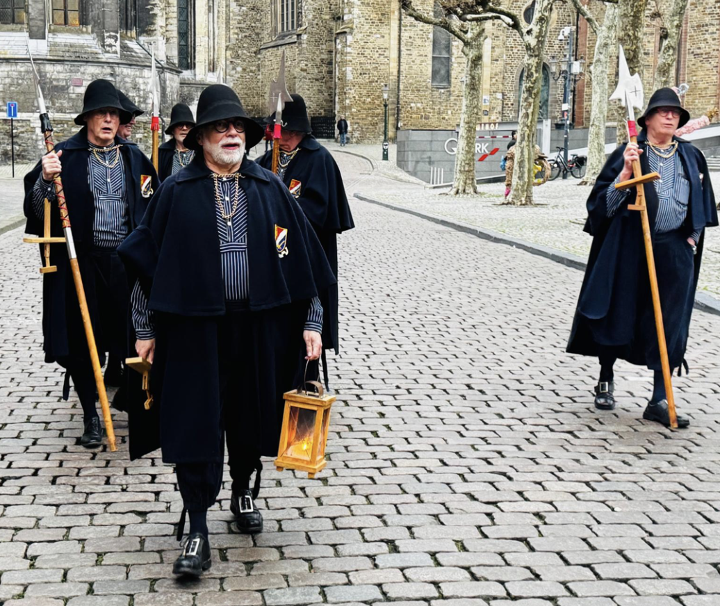 In de vroege van avond 3 april 2026 − Goede Vrijdag , de vrijdag vóór Pasen − is in de binnenstad van Maastricht voor de dertiende maal de Kruusweeg gelopen. ‘Ook nu weer ongelooflijk indrukwekkend,’ meent Theo Bovens, een van de zes leden van de Stiechting De Vief Köp, die zorgdraagt voor de organisatie.