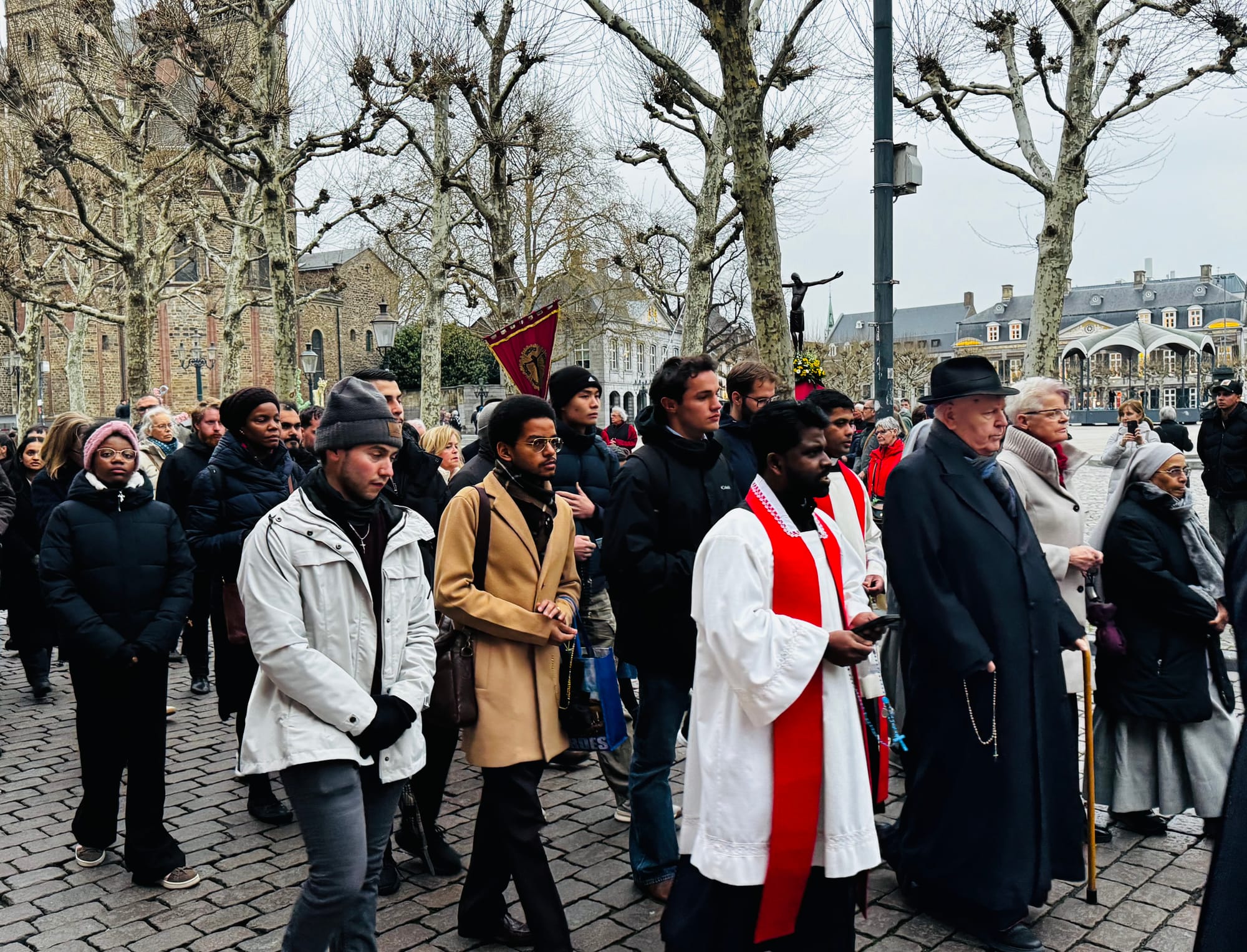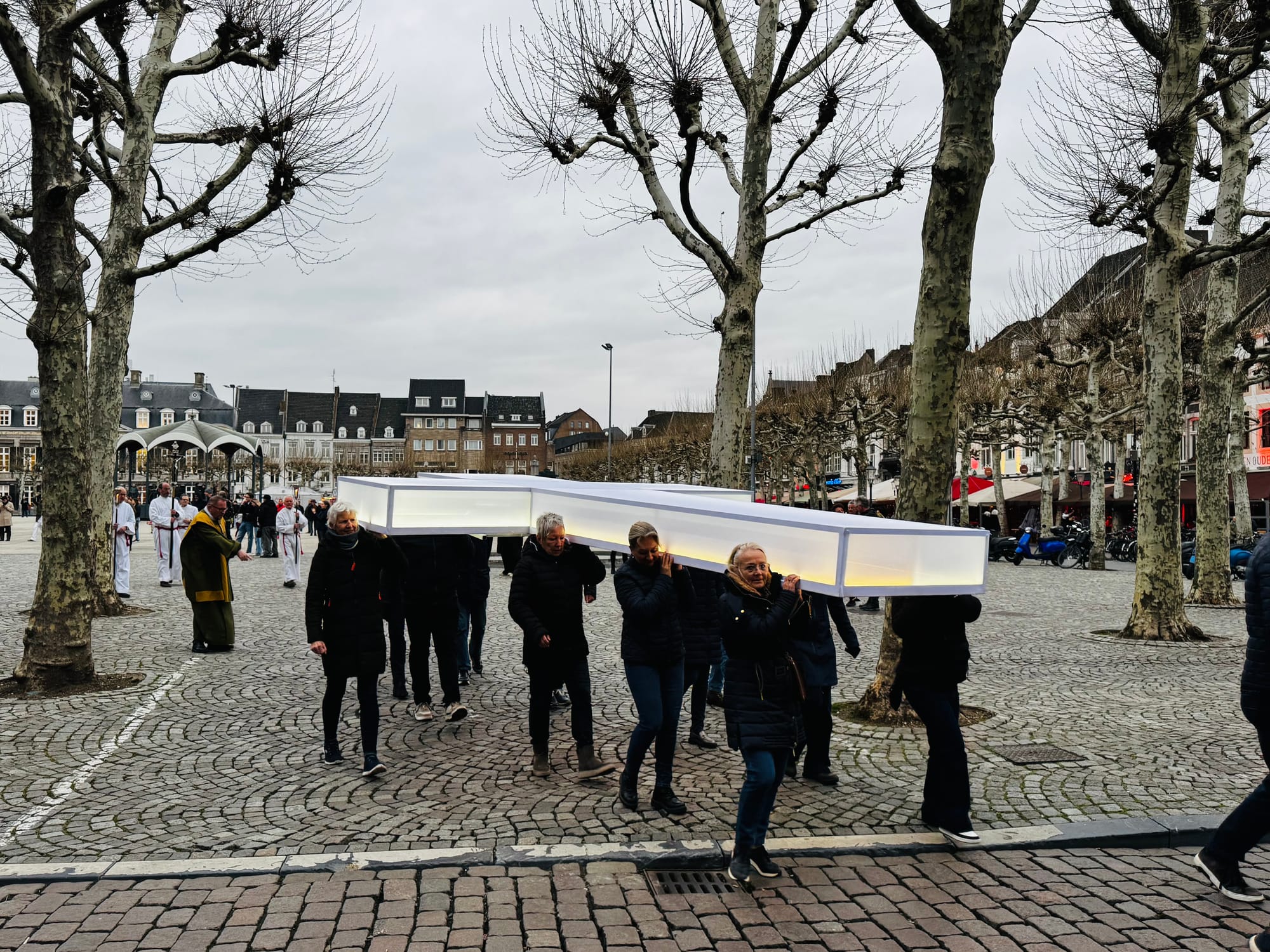 Deze opvatting wordt gedeeld door Deken Dautzenberg van de Sint-Servaasbasiliek, die samen met een grote groep biddende gelovigen, kapelaan Ignatious en emeritus-bisschop Wiertz de stoet sloot. ‘Je ziet dat de mensen langs de kant verwonderd zijn. Geraakt ook. Ik zou willen stellen dat we met de Kruusweeg een teken stellen. Ik ben ervan overtuigd dat dit teken gehoord en gezien wordt. Ik ben hoopvol gestemd.’