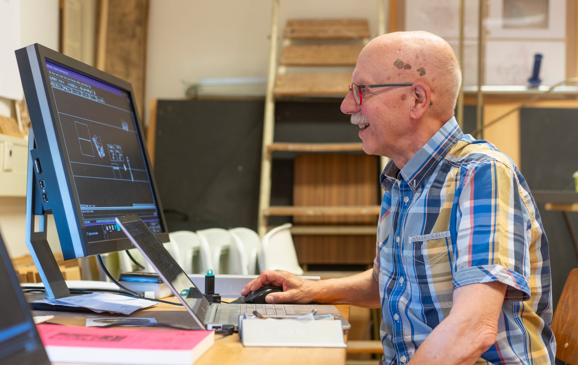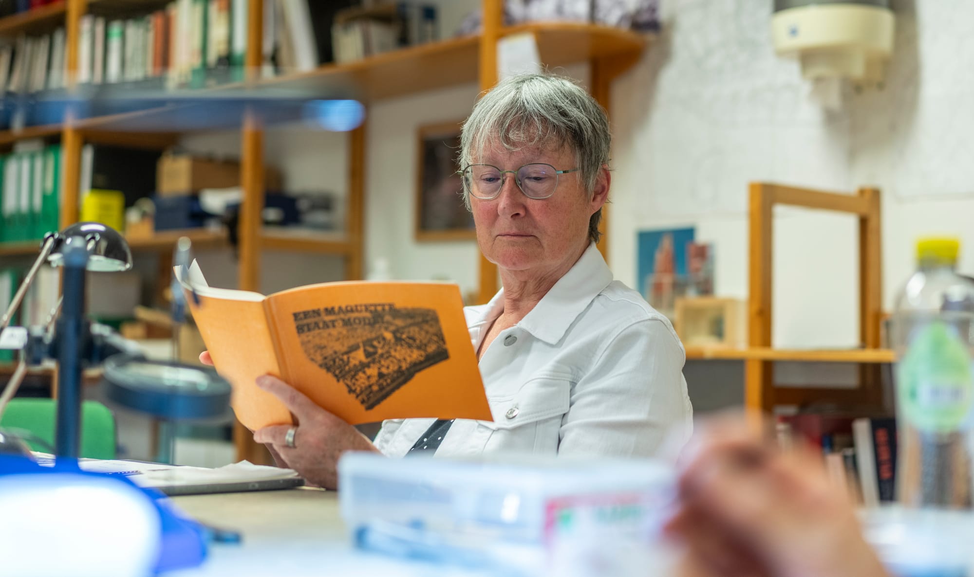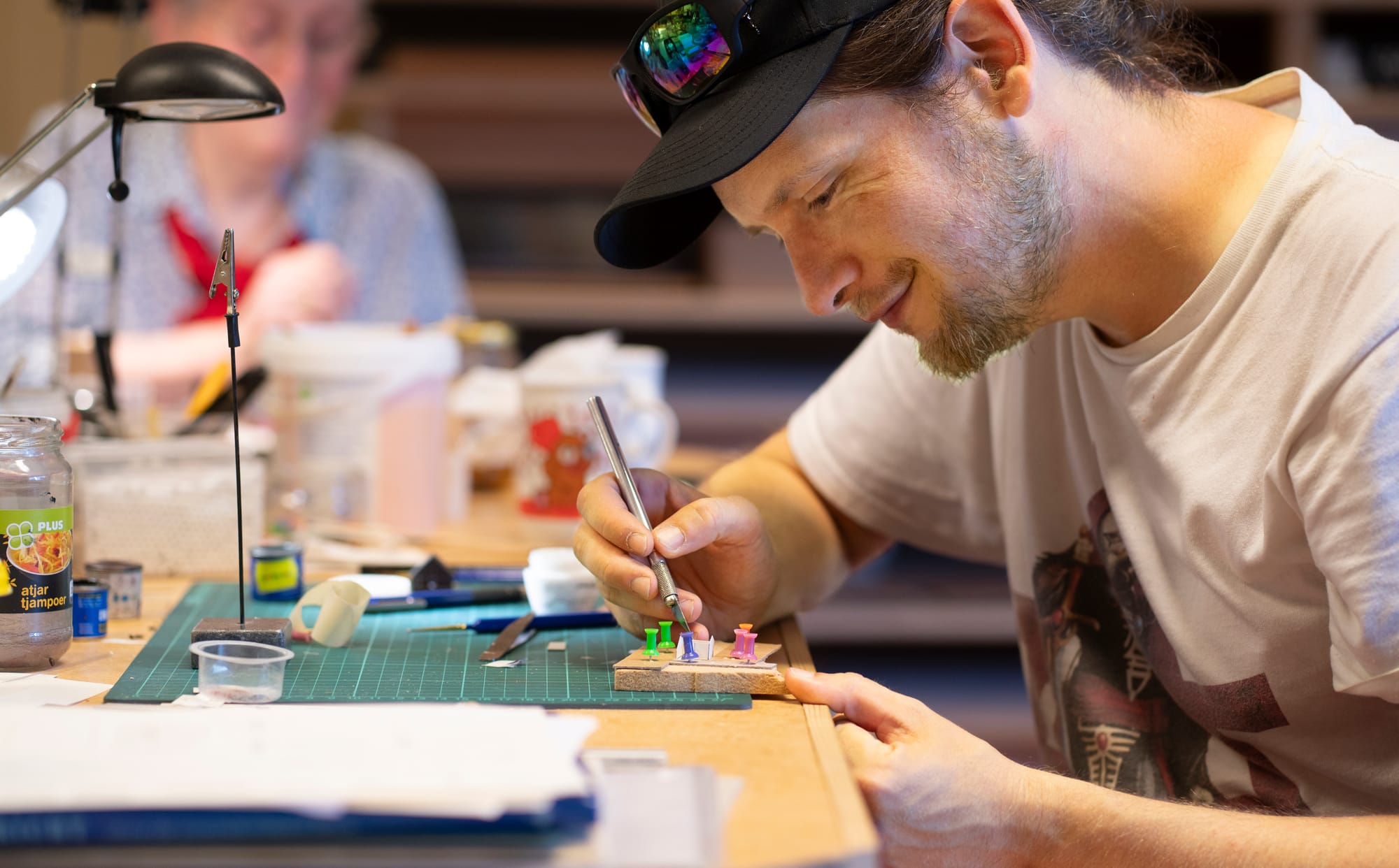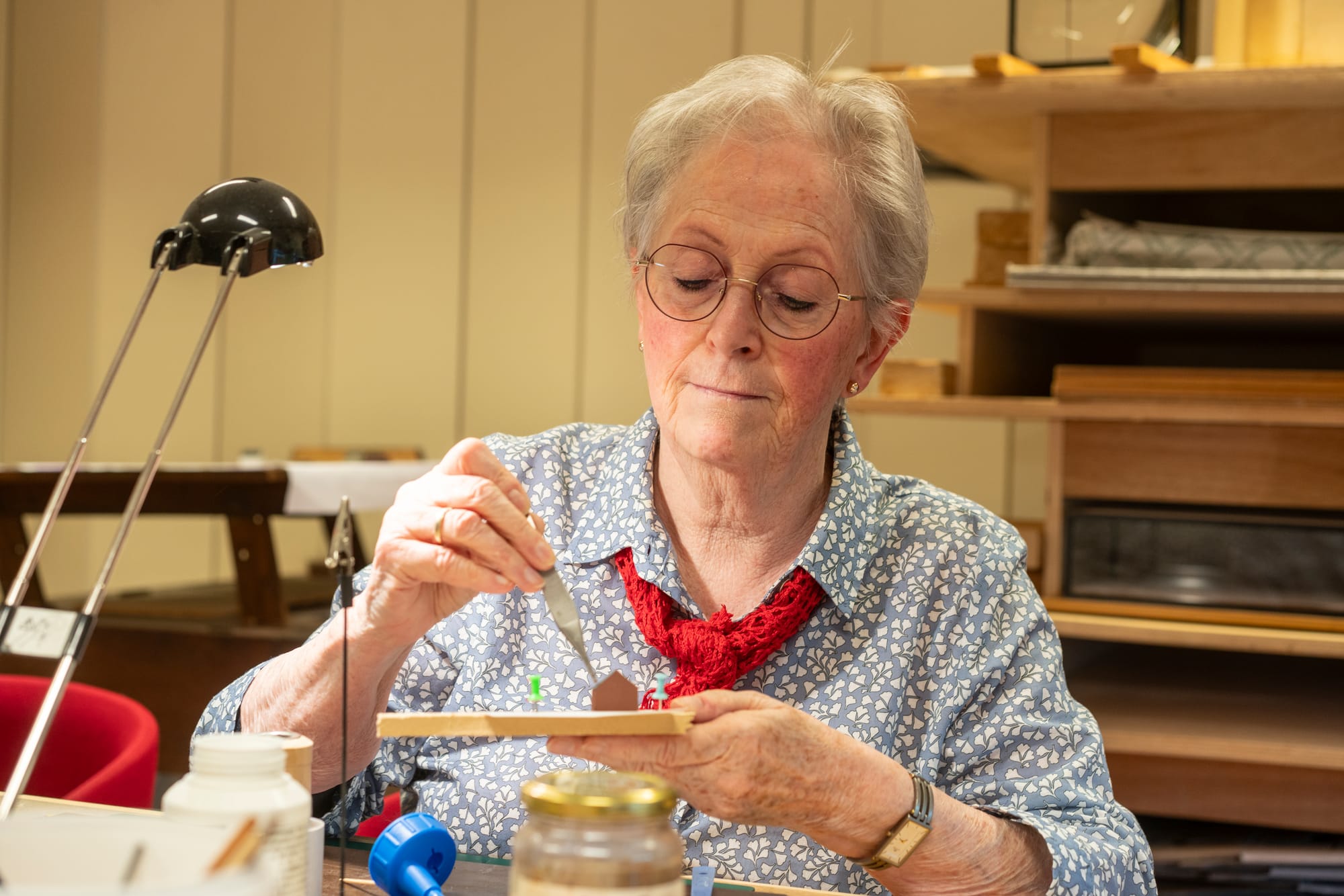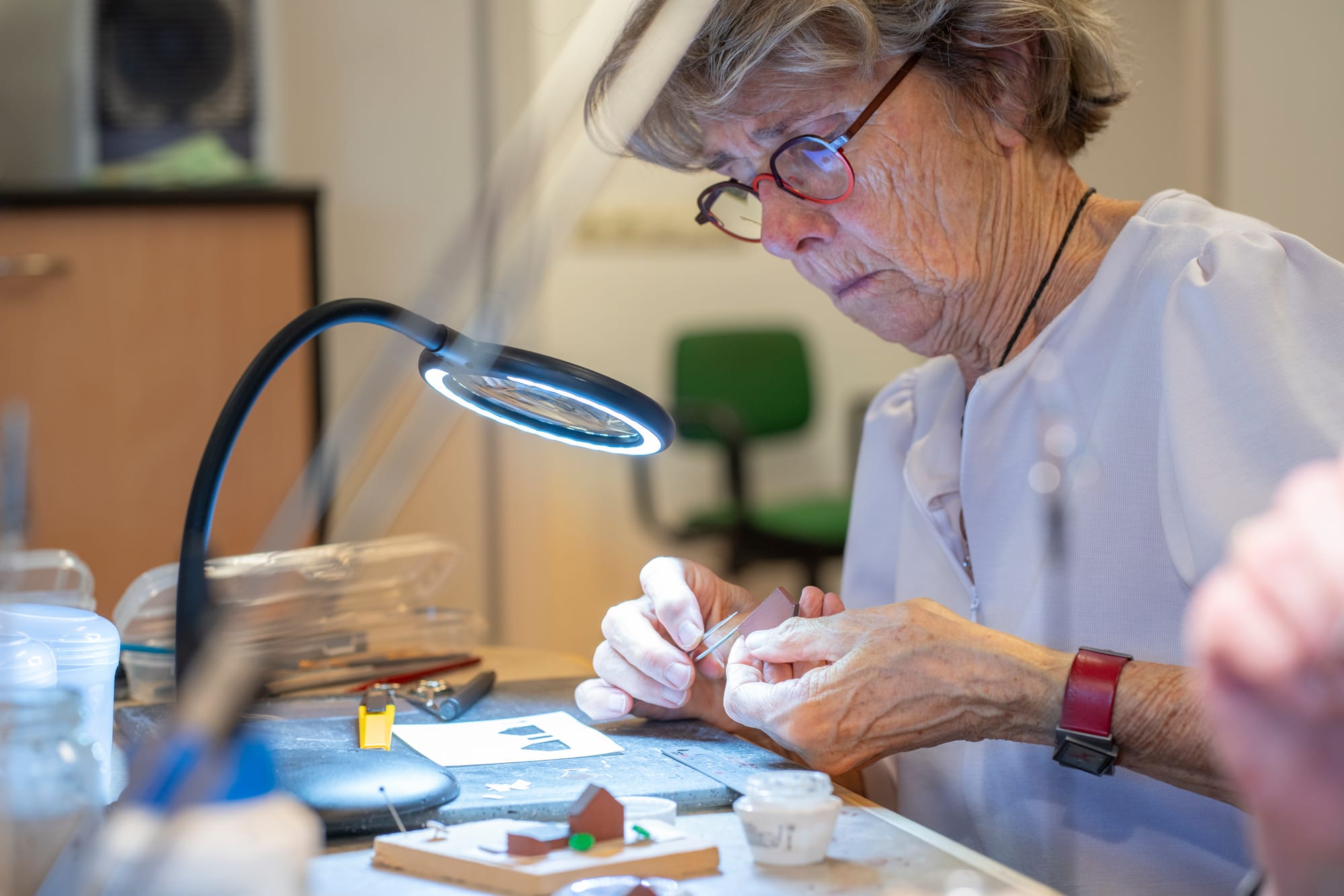 Als de tekeningen klaar zijn, starten de bouwers. Iedere woensdagavond zijn de tekenaars en bouwers te vinden in hun werkplaats in Randwyck. “Daar zit de ‘maakindustrie’”, zegt Peter Scheele lachend. Dat het monnikenwerk is, blijkt wanneer je een bezoek brengt aan de werkplaats op woensdagavond. Drie tekenaars zitten achter hun computer de bouwtekeningen te maken. Vijf bouwers zijn geconcentreerd bezig met hun minuscule werk. Chirurgenmesjes, pincetten en hele kleine verf- en lijmkwastjes zijn hun gereedschap. Dit is ambachtelijk vakmanschap. “We zijn zeker geen freubelclubje”, benadrukt Lucy Willems, die een van de bouwers is. “We laten een stuk geschiedenis van Maastricht na. Ik noem ons ook wel eens kathedraalbouwers, want het eindresultaat gaat over meerdere generaties heen. De uiteindelijke maquette zal ik waarschijnlijk nooit te zien krijgen.”