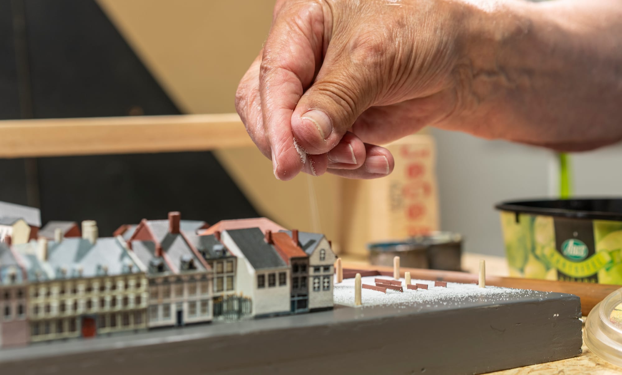 Het nabouwen van de stad, de vestingwerken en de buitengebieden is een monnikenwerk. Alles wordt op een schaal van 1:500 gebouwd. Dat betekent dat vijf meter in werkelijkheid neerkomt op slechts één centimeter op de maquette. Sommige huizen zijn niet groter dan een vingerkootje. Alle huizen worden gemaakt van dik papier en koud tegen elkaar geplakt. Als het dak erop zit, wordt het een stabiel geheel en kunnen de schilders aan de slag. Maar voor het zover is, is er al een lang traject aan voorafgegaan.