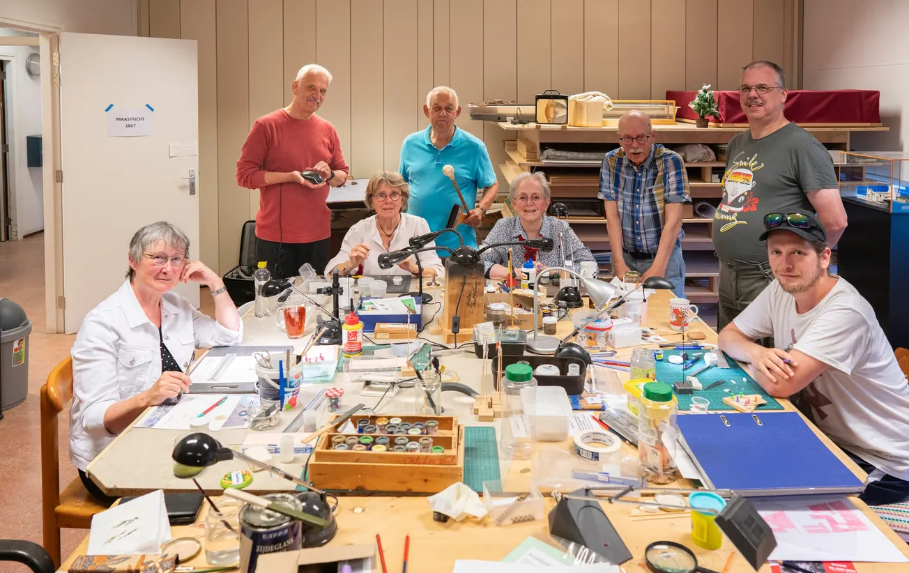 Als de tekeningen klaar zijn, starten de bouwers. Iedere woensdagavond zijn de tekenaars en bouwers te vinden in hun werkplaats in Randwyck. “Daar zit de ‘maakindustrie’”, zegt Peter Scheele lachend. Dat het monnikenwerk is, blijkt wanneer je een bezoek brengt aan de werkplaats op woensdagavond. Drie tekenaars zitten achter hun computer de bouwtekeningen te maken. Vijf bouwers zijn geconcentreerd bezig met hun minuscule werk. Chirurgenmesjes, pincetten en hele kleine verf- en lijmkwastjes zijn hun gereedschap. Dit is ambachtelijk vakmanschap. “We zijn zeker geen freubelclubje”, benadrukt Lucy Willems, die een van de bouwers is. “We laten een stuk geschiedenis van Maastricht na. Ik noem ons ook wel eens kathedraalbouwers, want het eindresultaat gaat over meerdere generaties heen. De uiteindelijke maquette zal ik waarschijnlijk nooit te zien krijgen.”