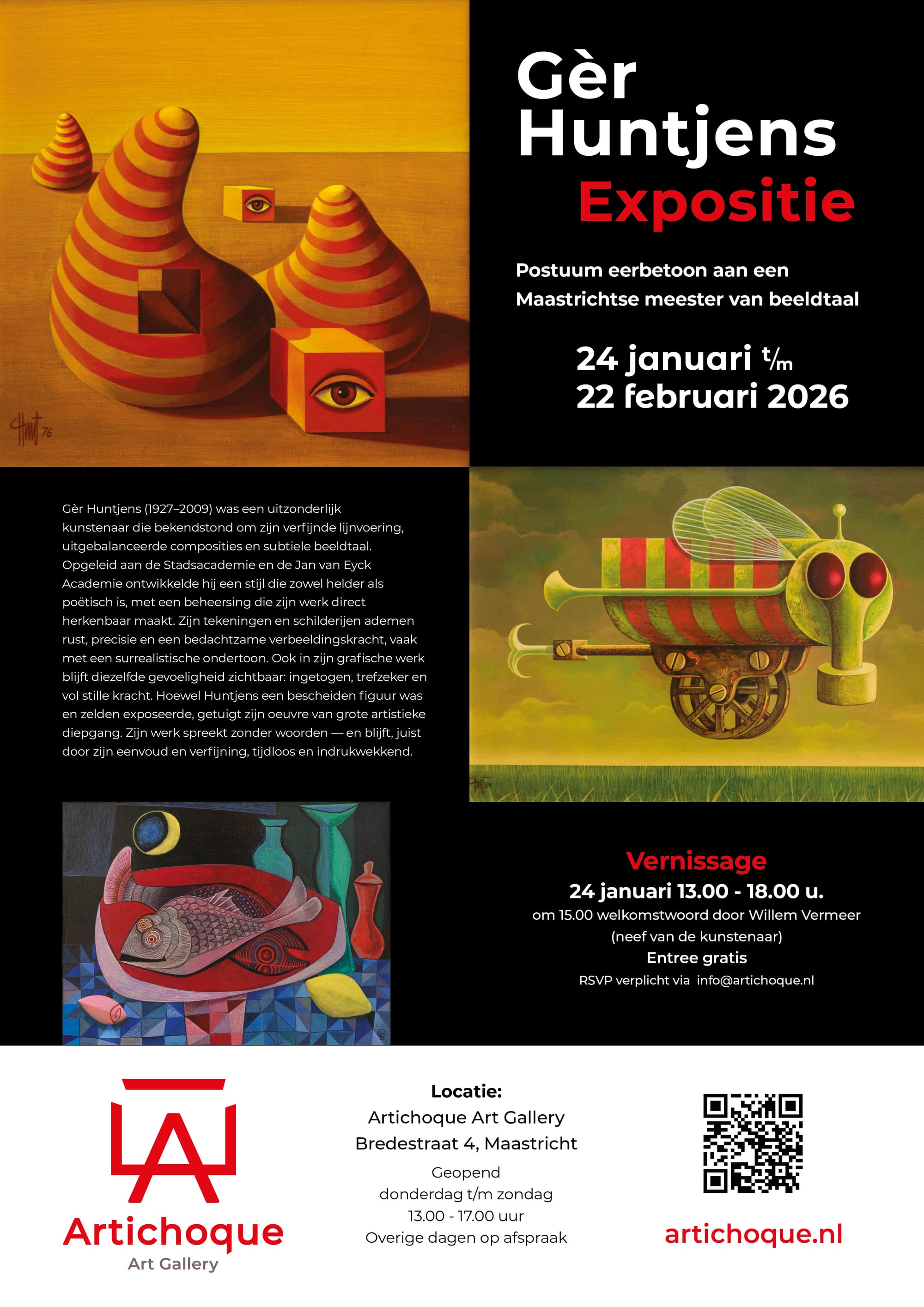 Zaterdag 24 januari opent van 13.00 tot 18.00 in Artichoque Art Gallery een tentoonstelling met een bijzondere selectie uit zijn surrealistische oeuvre. Het welkomstwoord wordt om 15.00 verzorgd door Willem Vermeer, een neef van de kunstenaar.