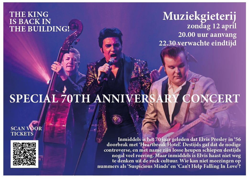 Op zondag 12 april 2026 wordt dit muzikale erfgoed groots gevierd tijdens The Elvis Concert – Special 70th Anniversary Concert in de Muziekgieterij. Een avond waarop Maastricht even verandert in Memphis.