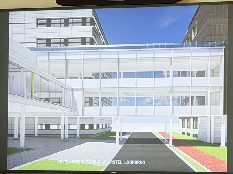 Het nieuwe entreegebouw moet aangesloten worden op de bestaande parkeergarage en wordt ook aangesloten op de glazen luchtbrug die er nu ook al is.