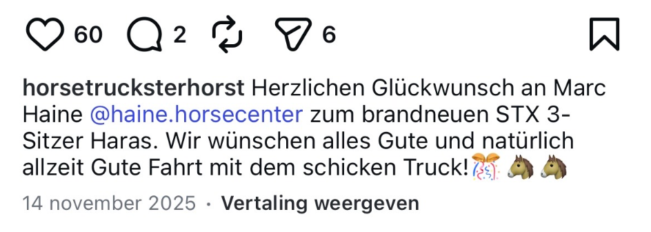 Op de foto staat Haine naast een gloednieuwe paardentrailer met een waarde van minstens 70.000 euro met een boeket bloemen in de hand. Het lijkt erop dat het bedrijf de trailer net heeft afgeleverd. Het bedrijf plaatst op Instagram dan altijd dit soort foto's. Haine ontkent dat hij de trailer heeft gekocht: "Ik had hem maar gehuurd voor één dag. Vraagt u maar na bij het bedrijf. Dat is het enige commentaar dat ik geef." Haine weigert verder elk commentaar. Ook op de vraag of hij zich kan voorstellen dat gedupeerden van zijn bedrijf zich storen aan zo'n foto? Haine: "Uw vragen leiden alleen tot negatieve publiciteit. Belt u mijn advocaat maar."