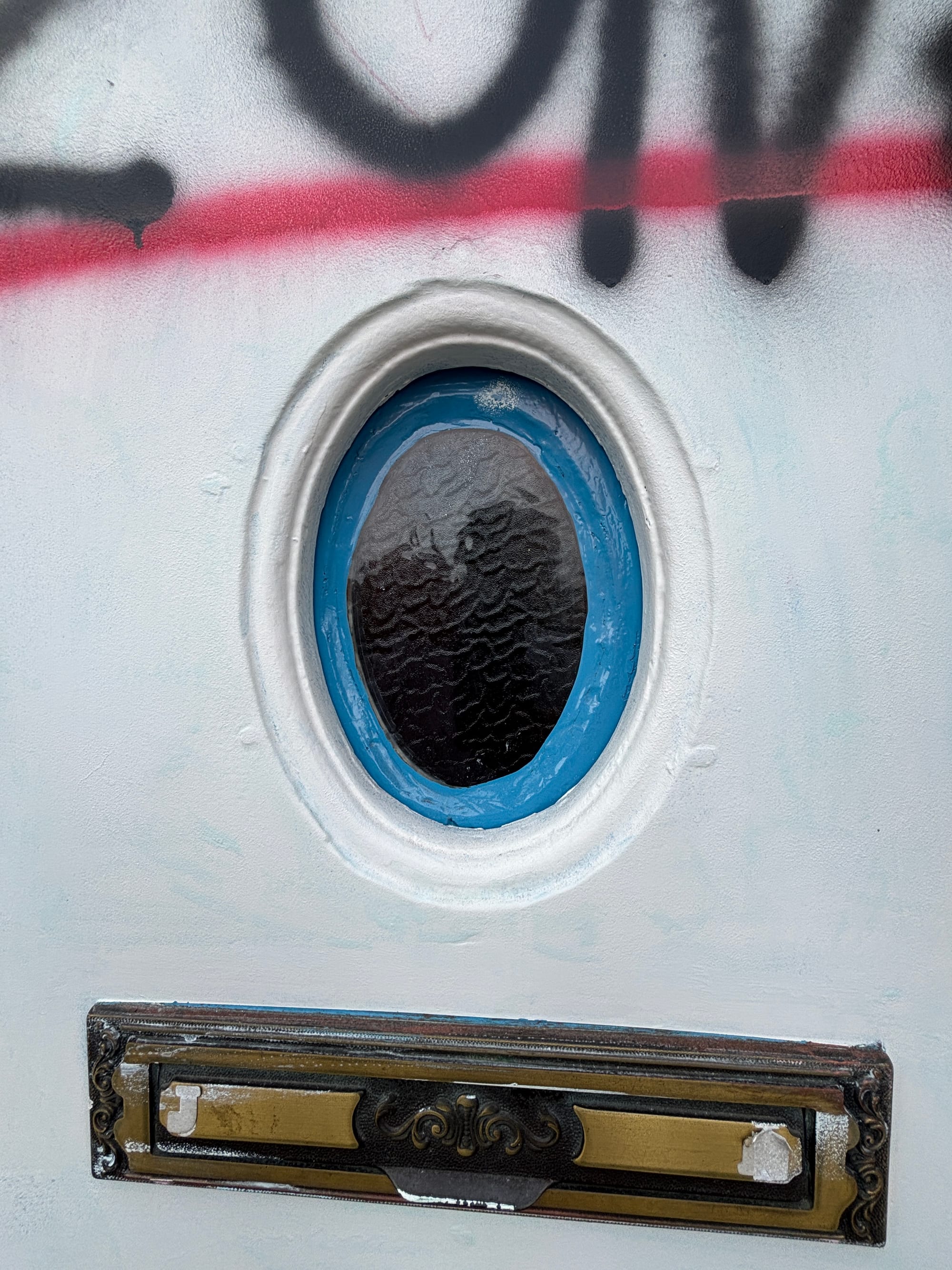 Nadere bestudering van met name het kijkvenster in het midden van de deur lijkt er inderdaad op te wijzen dat het 'kunstwerk' zelf is aangebracht: toen de deur wit werd gespoten, stond het kijkvenster waarschijnlijk open, dat daardoor zonder ook maar een witte spetter nog steeds blauw is. Want heel bedreven met de spuitbus is de aanbrenger niet geweest: kijk maar eens hoe het rode 'verbodsbord' is uitgelopen.