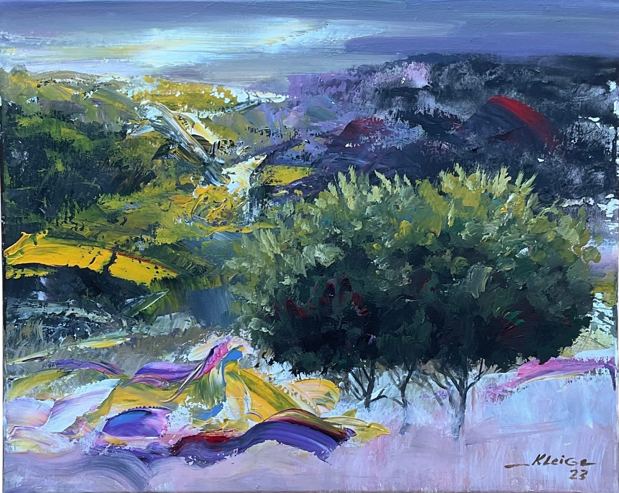 Ahmed Kleige combineert invloeden uit het Midden-Oosten met een moderne, vaak abstracte beeldtaal. Zijn werk kenmerkt zich door krachtige kleuren en gelaagde composities rond thema’s als identiteit en cultuur.