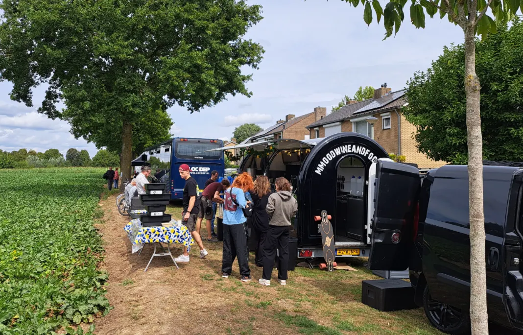 Rond het middaguur streek de voltallige crew, circa 35 personen, voor de lunch neer aan de Keramieksingel (zie foto). Na de lunch werden de opnamen in de Silexstraat voortgezet.
