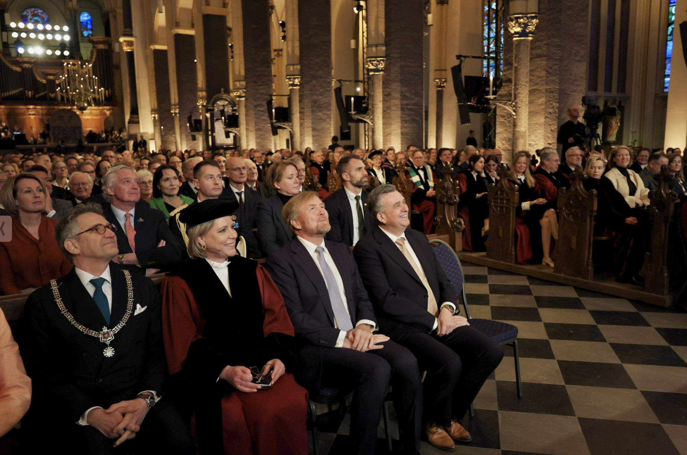 Op de foto zien we hoe de geschiedenis zich exact herhaalt. Koning Willem-Alexander tekent bij gelegenheid van het vijftigjarig bestaan van de Universiteit Maastricht. In dezelfde foto zien we in een identieke setting Koningin Wilhemina tekenen bij de oprichting van de Universiteit in 1976. En het derde verhaal is Rianne Letschert, de bestuursvoorzitter van de universiteit die met een glimlach toekijkt.