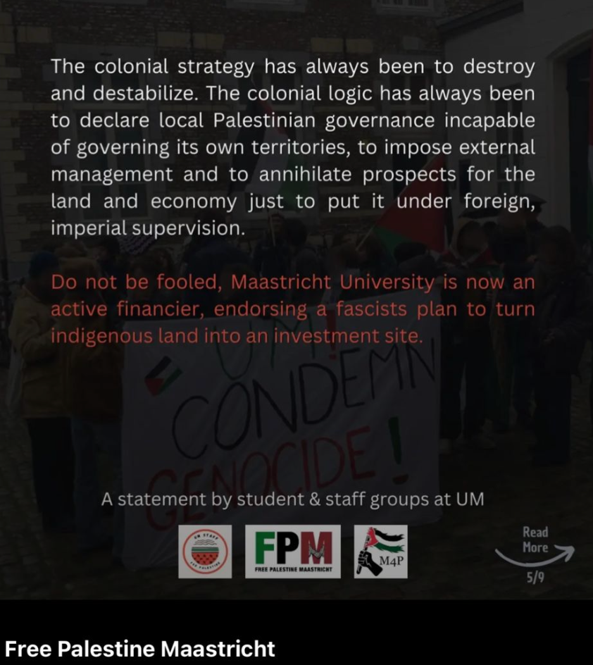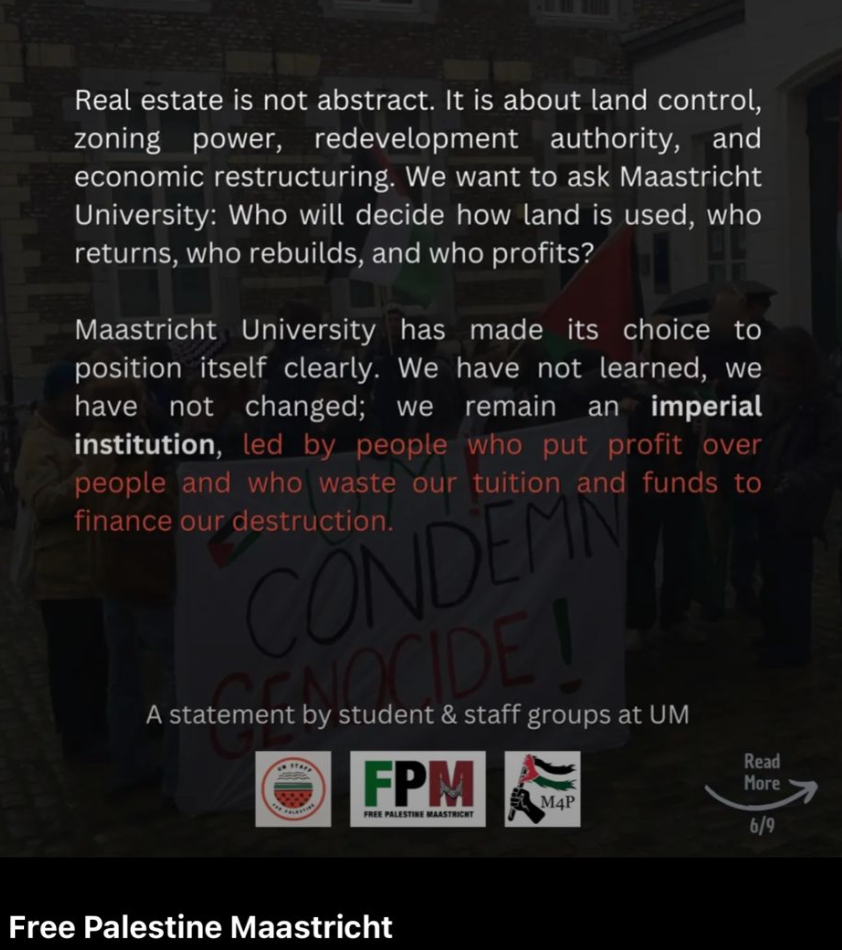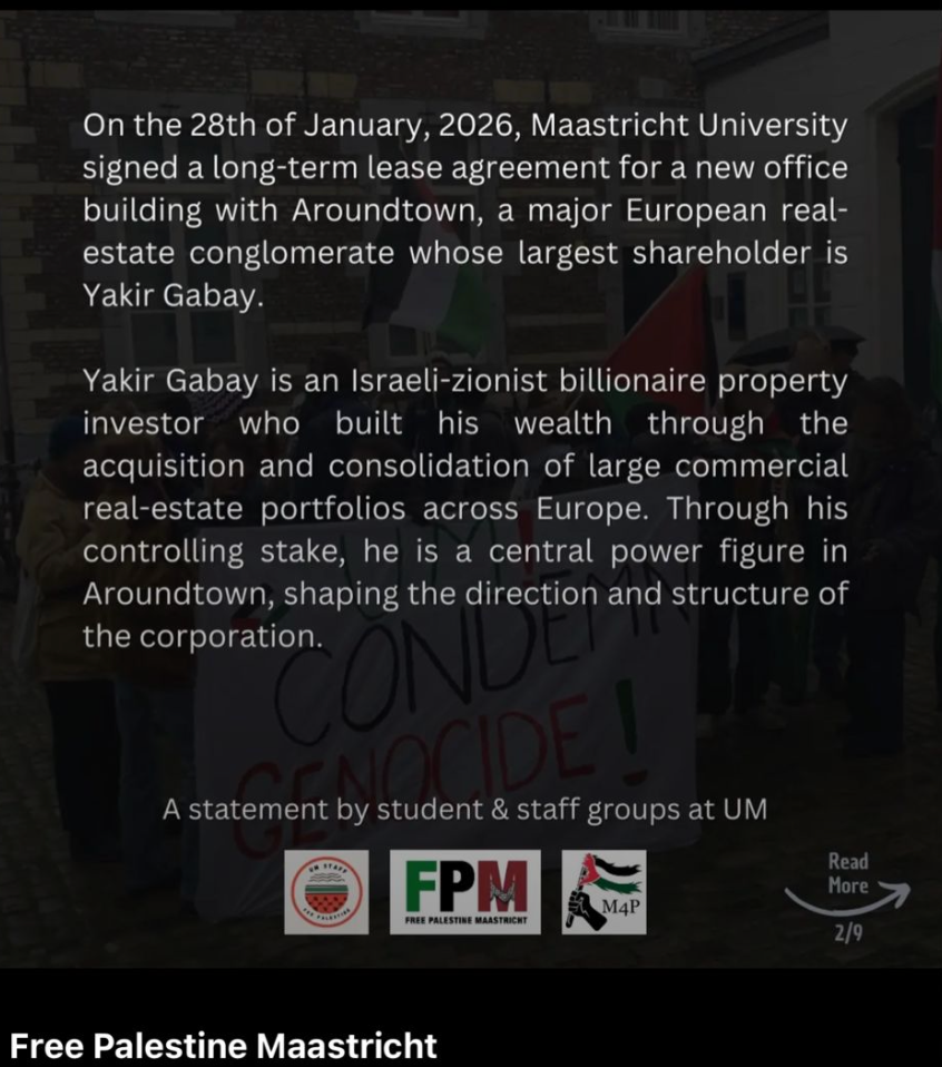 Free Palestine Maastricht (FPM) en studenten en stafleden van de universiteit beschuldigen de Universiteit Maastricht opnieuw, nu van samenwerking met een "Israëlische zionist-miljardair." Die beschuldiging wordt gedaan omdat de UM een pand in Randwyck is gaan huren dat eigendom is van Aroundtown SA.