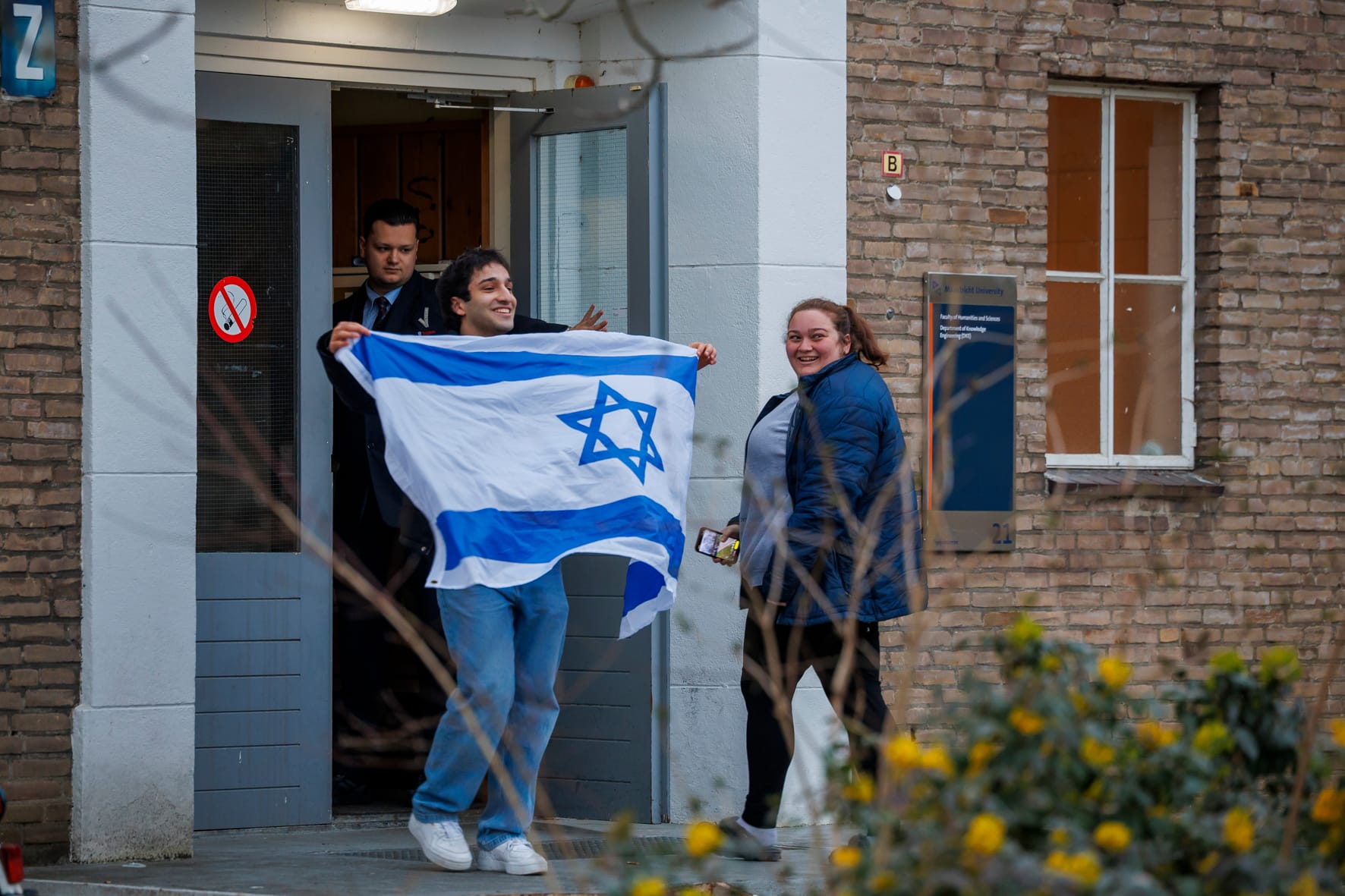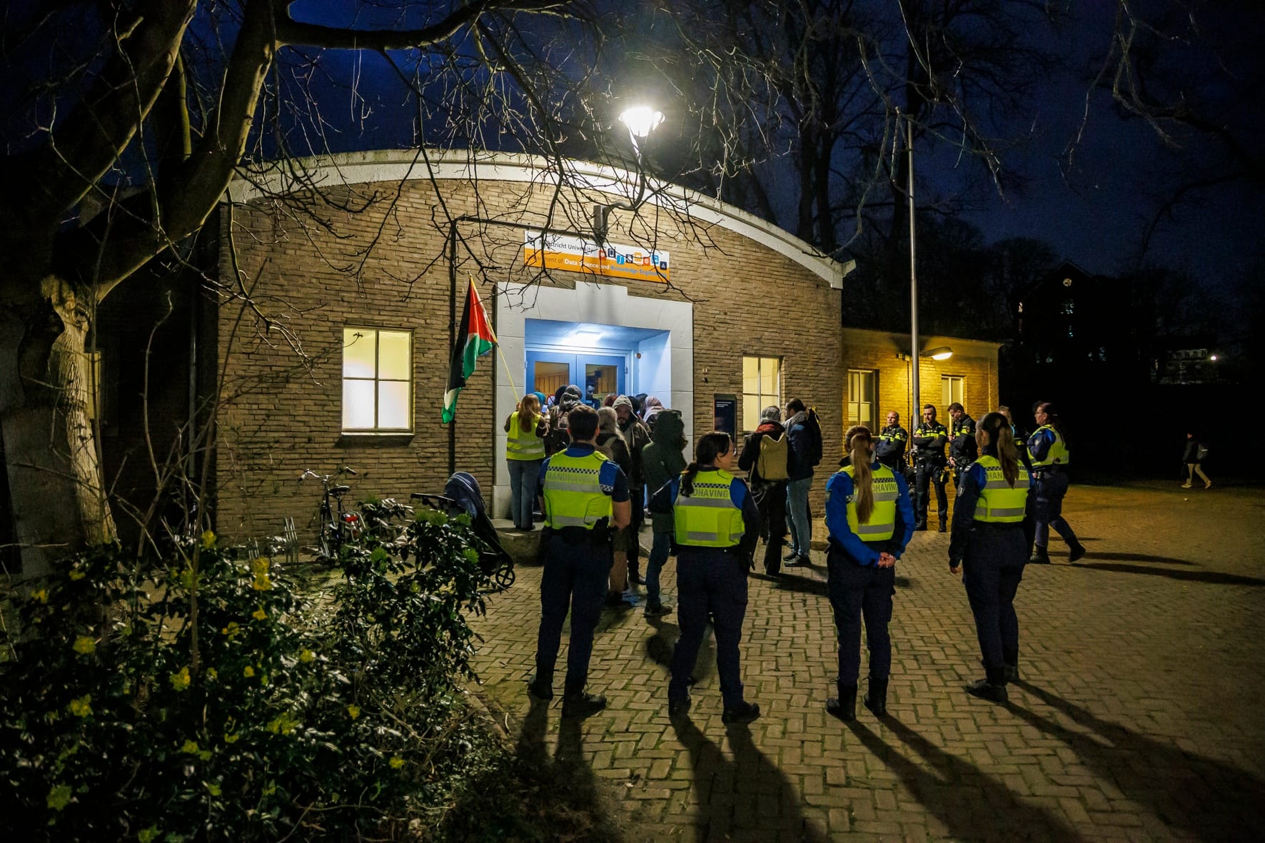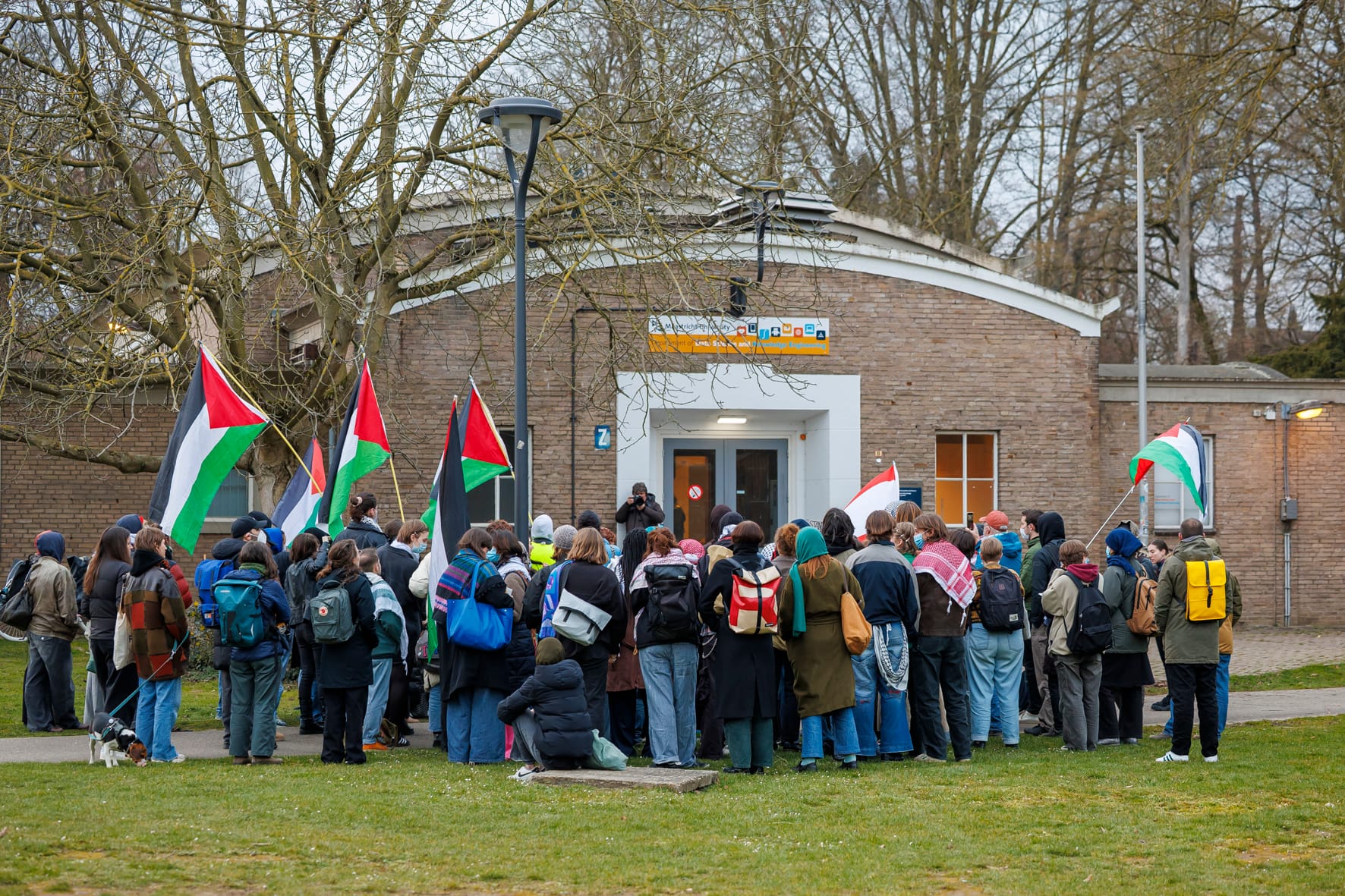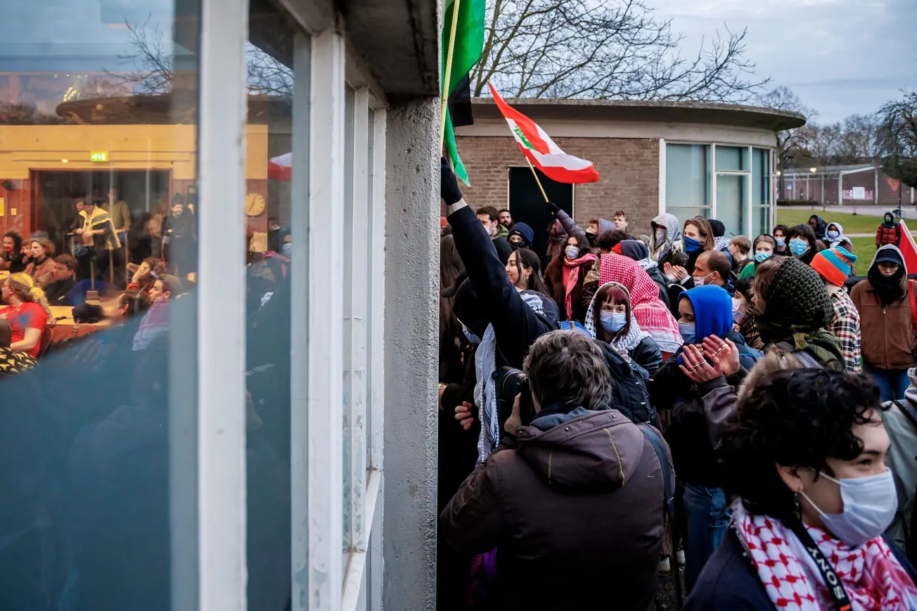 Free-Palestine-activisten, voornamelijk buitenlandse studenten van de universiteit, ronselden aan het begin van de week al mensen om actie te voeren bij de Tapijnkazerne waar de lezing werd gehouden.
