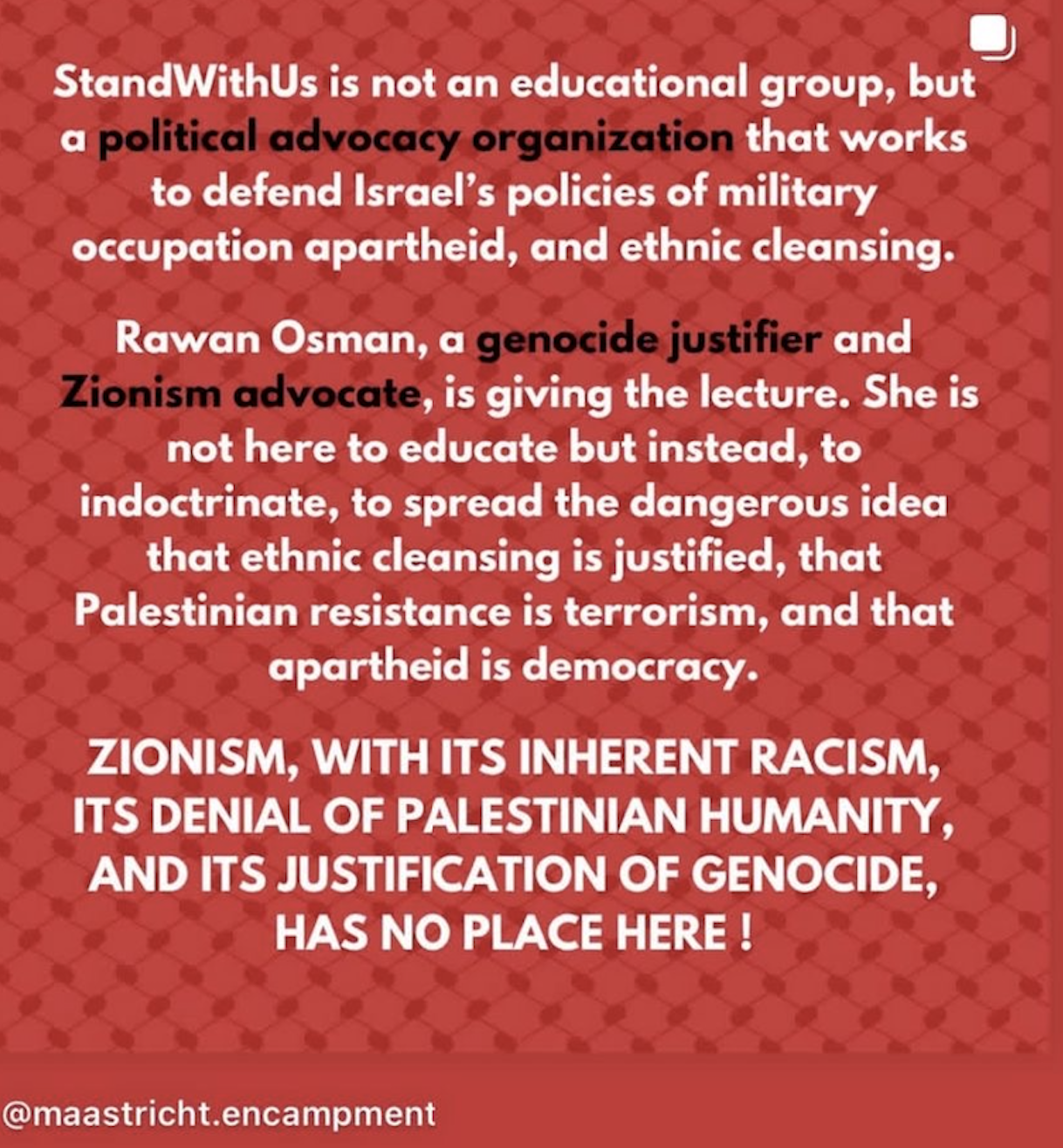 Rawan Osman was uitgenodigd om bij de Maastrichtse universiteit te spreken. Osman sprak er over haar ideologische transitie van steun voor terroristen tot Zionist worden. Sinds de aanslagen van de terroristen van Hamas in oktober 2023, spreekt Osman zich uit voor steun aan Israël. Om die reden wordt ze ook ernstig bedreigd.
