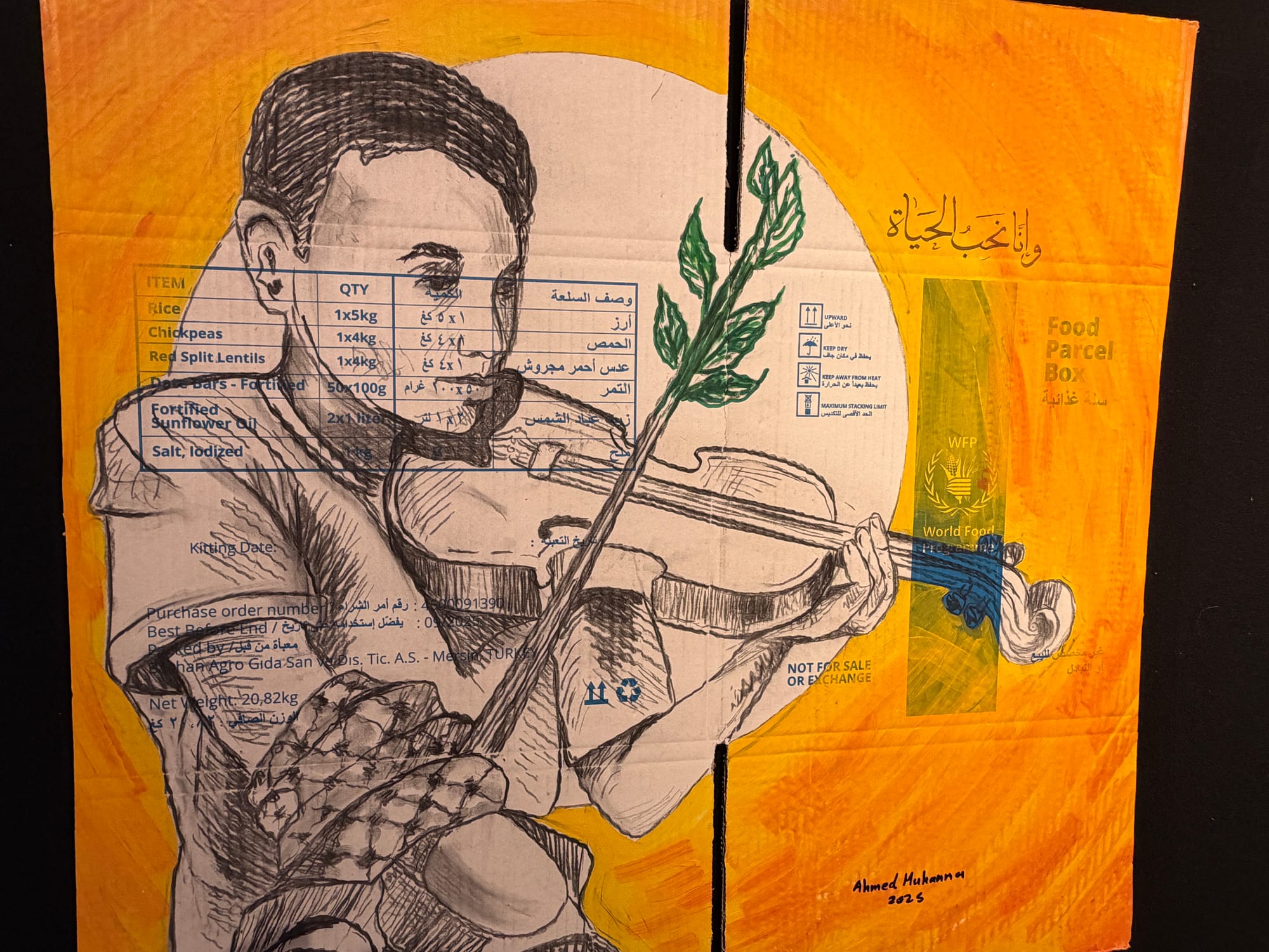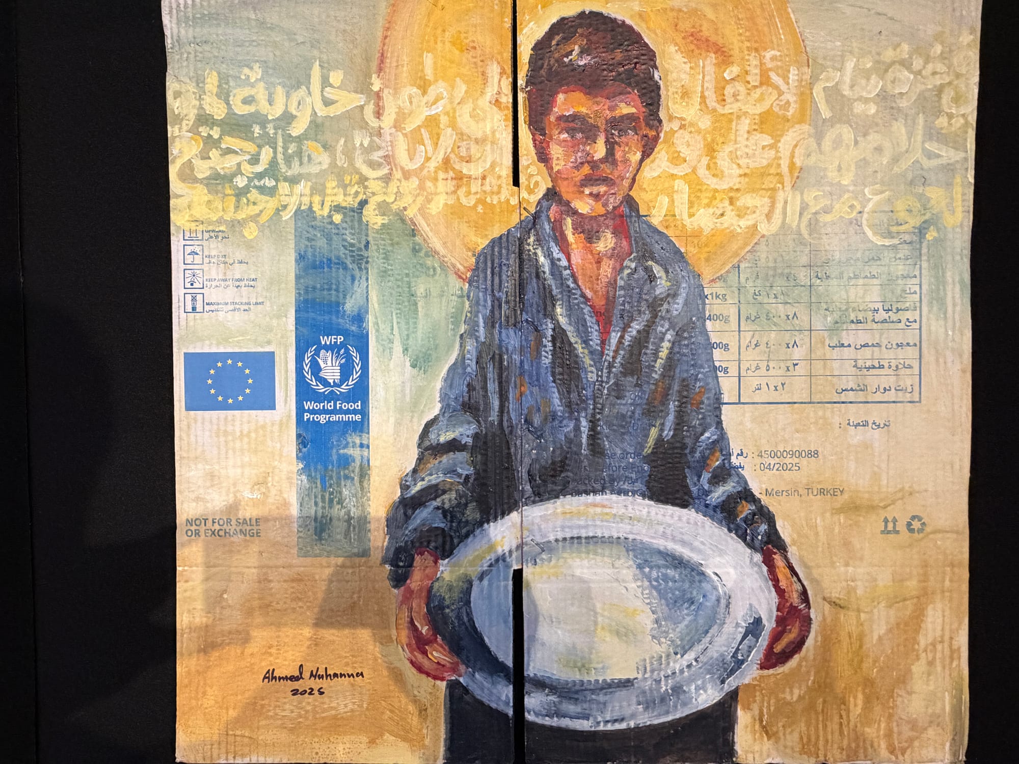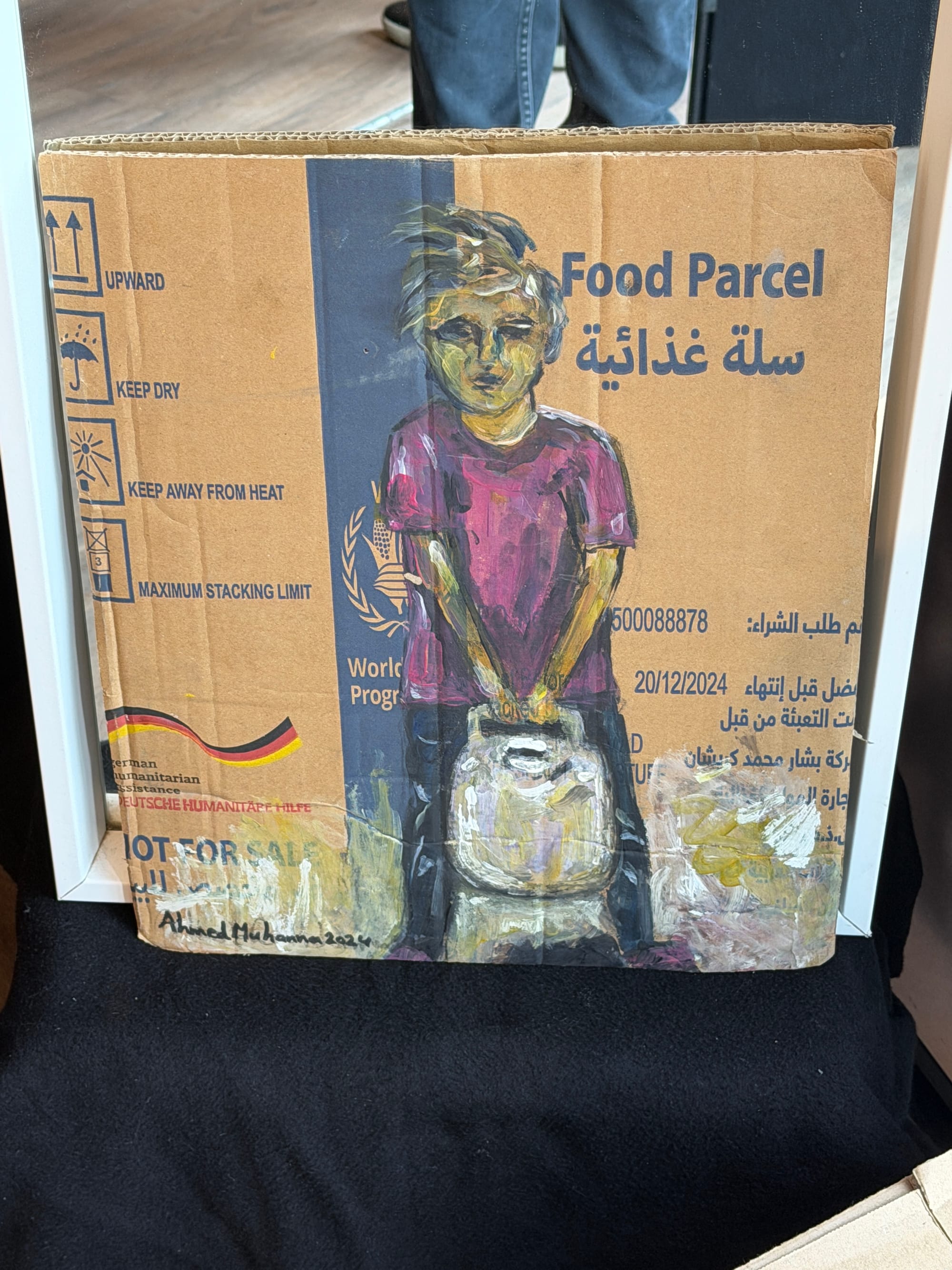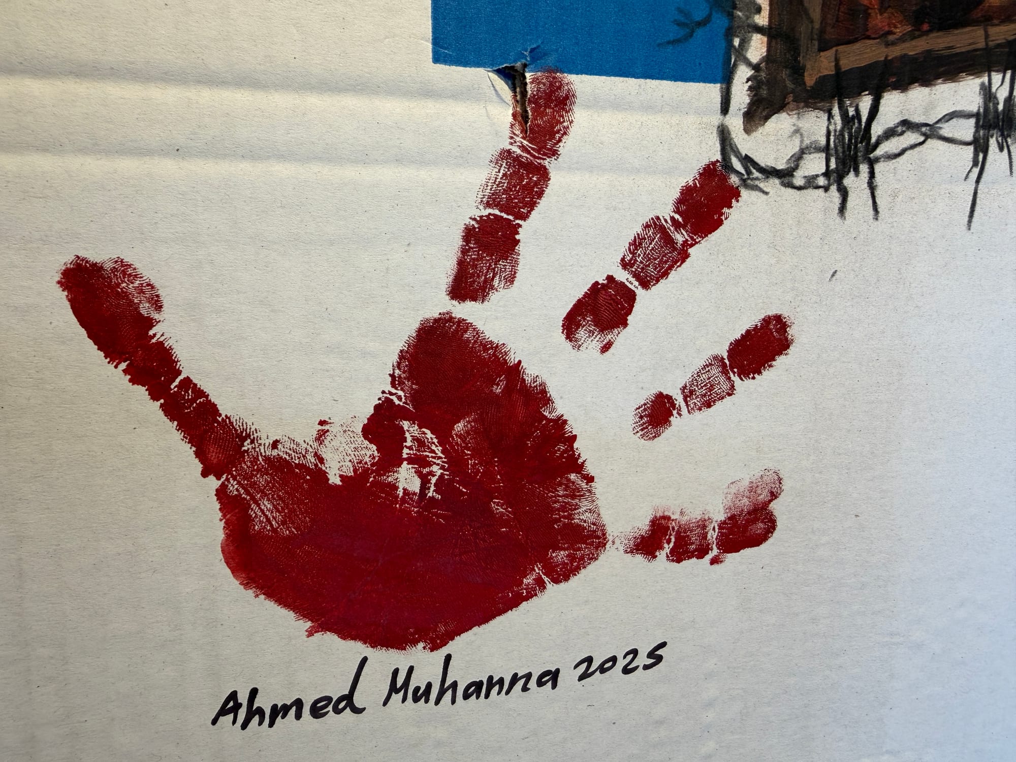 Ahmed Muhanna is deze keer de exposerend kunstenaar. Geboren en getogen in de Gaza, opgeleid als kunstenaar aan de Al Aqsa universiteit. Niet alleen kunstenaar, maar ook met kwast en doek therapeut voor kinderen met traumatische ervaringen.