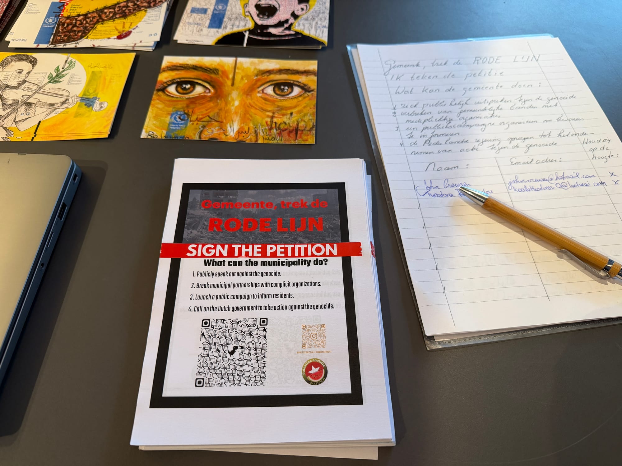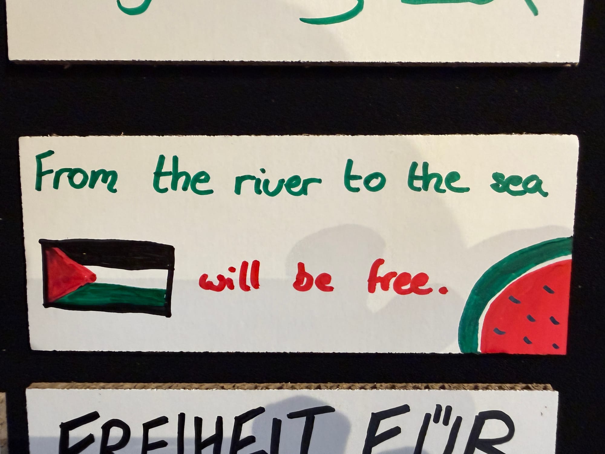 Bezoekers kunnen in de truck de petitie 'Gemeente, trek de rode lijn' tekenen. Ook is het mogelijk een boodschap te schrijven of te tekenen in de kleuren van de Palestijnse vlag. Met altijd weer die omstreden leus: 'From the river to the sea, Palestine will be free'.