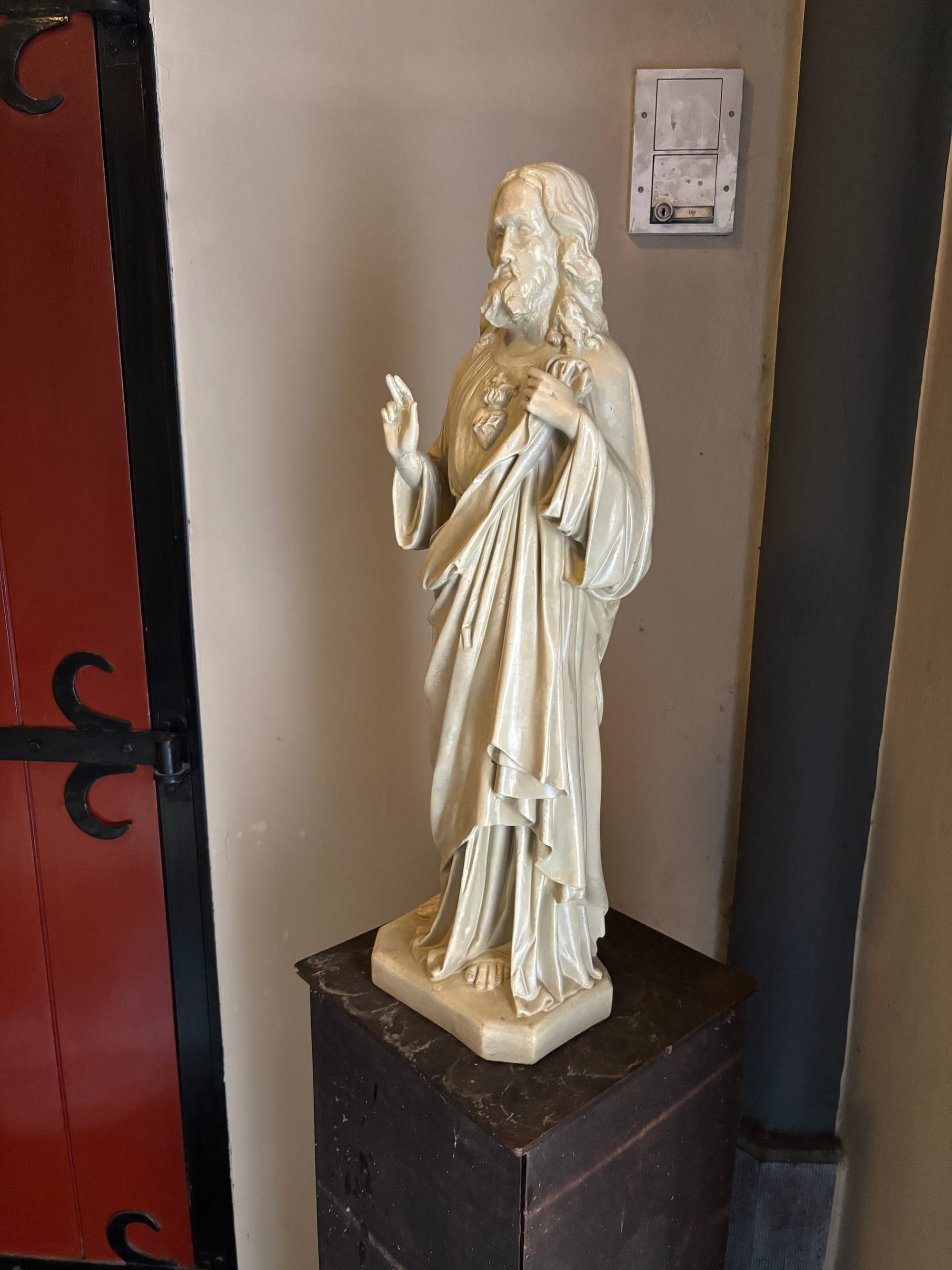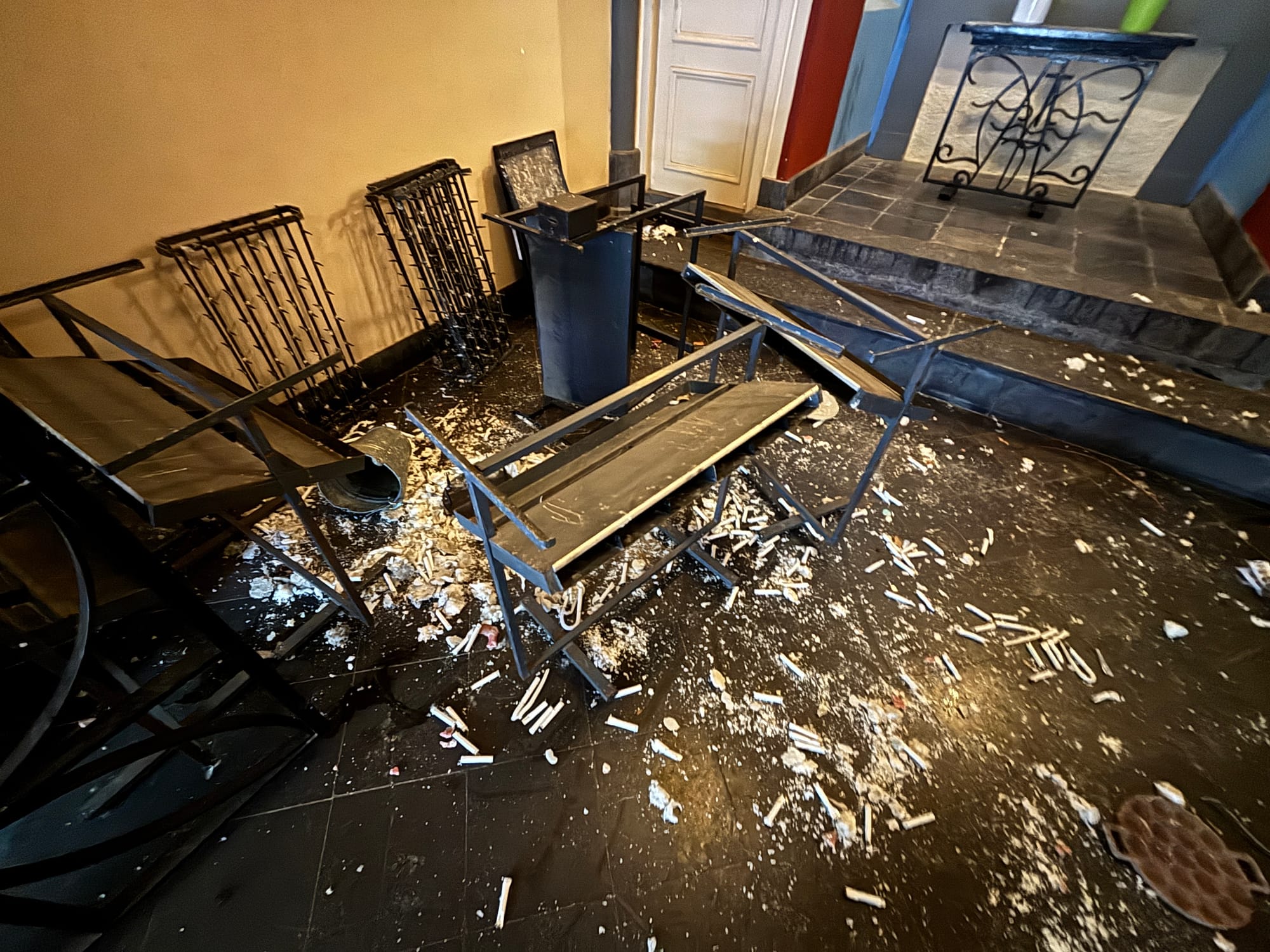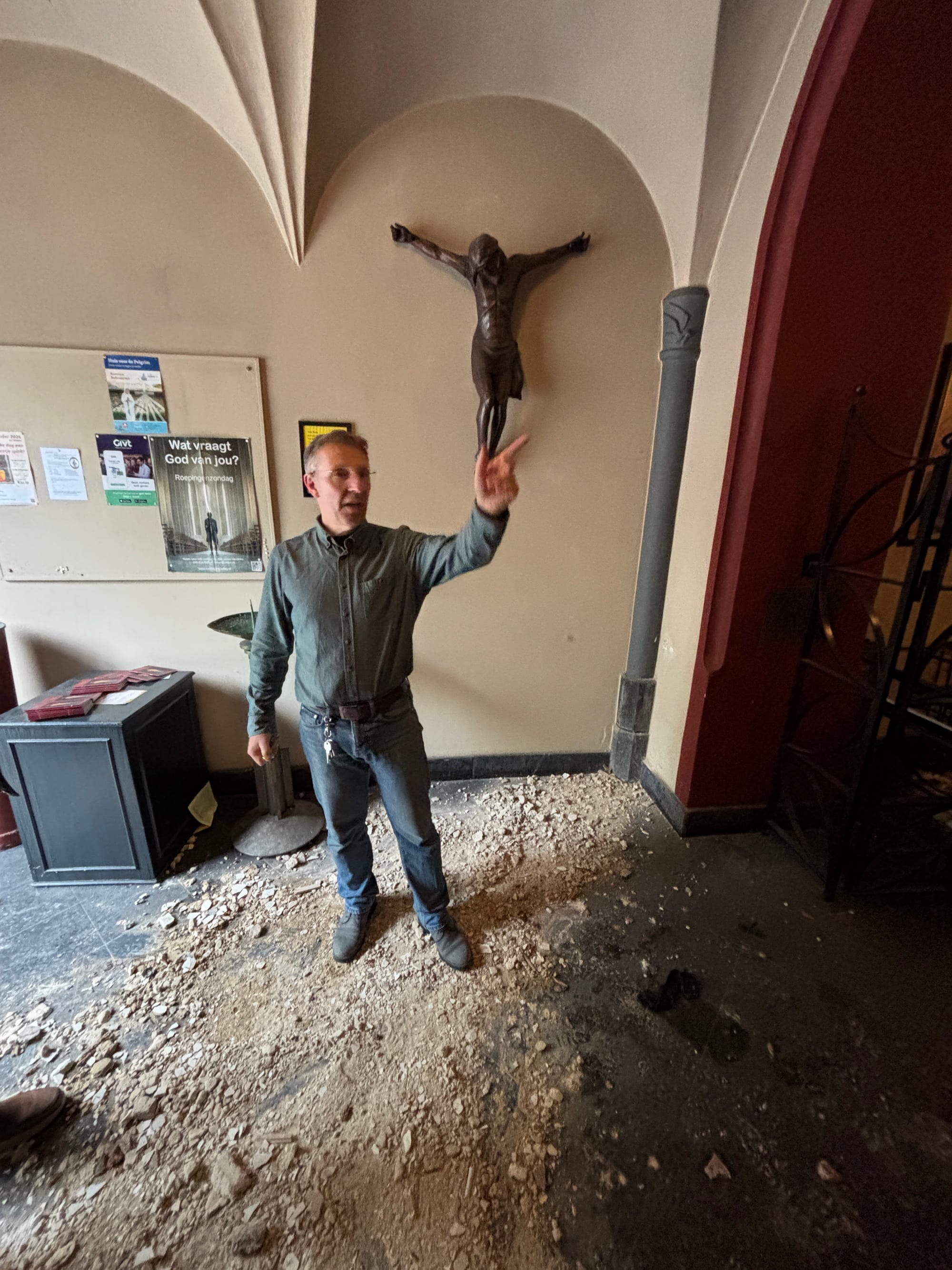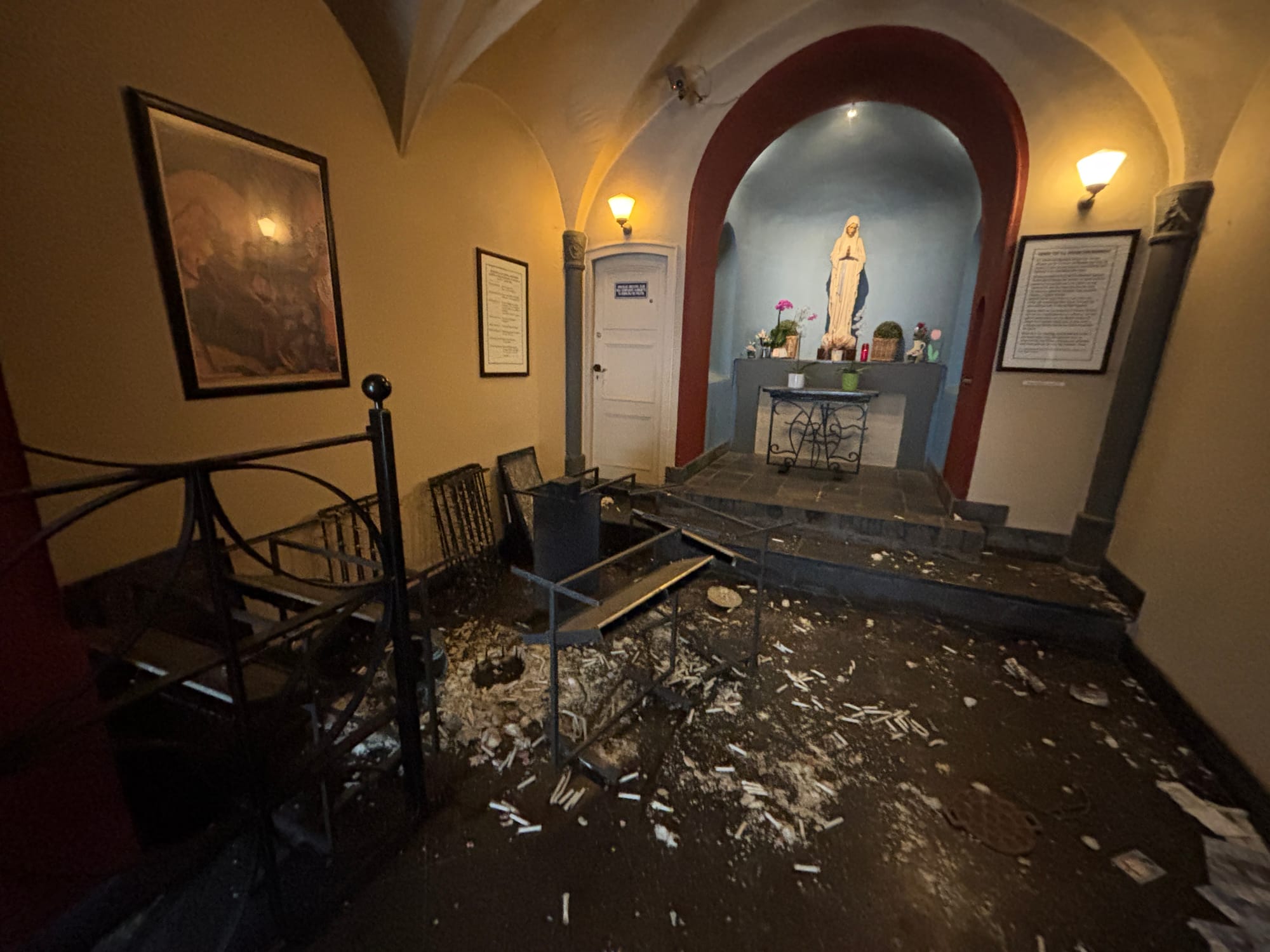 De brokken mergel die voor in de kapel liggen zijn een contra-gewicht voor een van de beelden. Achter in de kapel, bij het Mariabeeld, zijn de kaarsenstandaarden omgegooid en opnieuw 'gerangschikt'. Toen de politie arriveerde was de man, een bekende, net weg. Volgens de beheerders - die de man ook kennen - wordt de man agressief als hij benaderd wordt.
