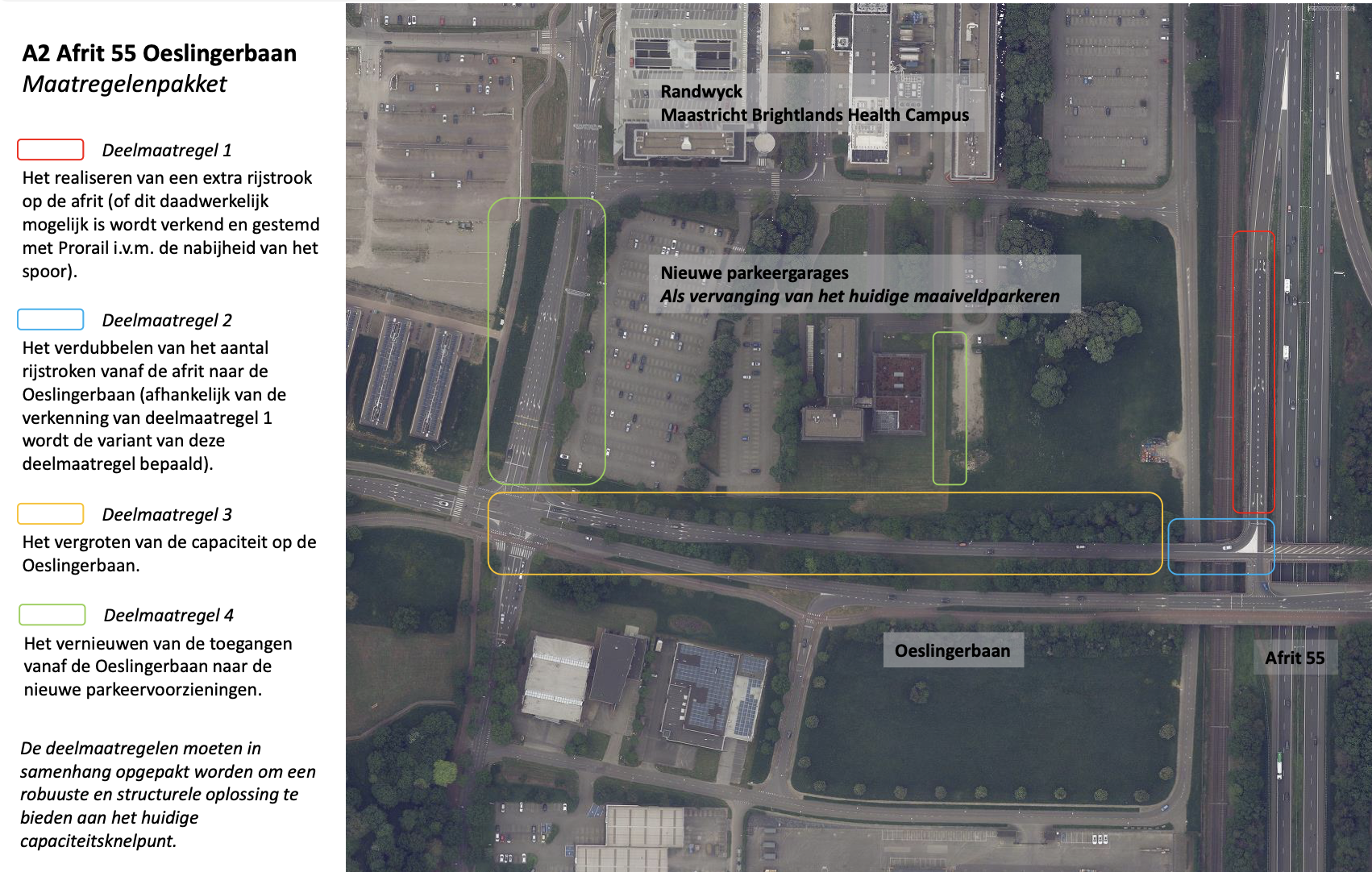 Het maatregelenpakket bestaat uit vier onderdelen: extra rijstrook op de afrit (in afstemming met ProRail); verdubbeling van rijstroken richting Oeslingerbaan; vergroting van de capaciteit op de oeslingerbaan; toegangsweg naar nieuwe parkeervoorzieningen van MUMC+ en UM.