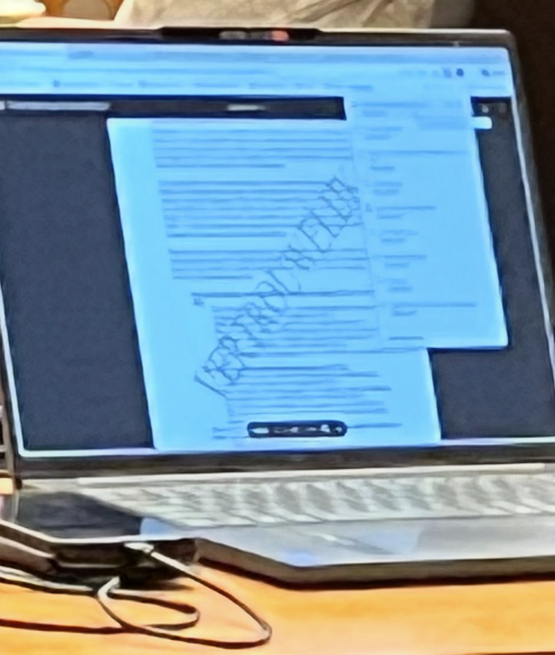 Dat we geen 'echte Telegraaf' zijn, blijkt wel uit de volgende foto. In principe is het een gevalletje 'Functie elders', maar ik heb het computerscherm bewust een beetje wazig gemaakt. Een van de raadsleden had namelijk op haar scherm groot 'vertrouwelijk' staan. In principe geen probleem, tenzij de perstribune vlak achter je is.