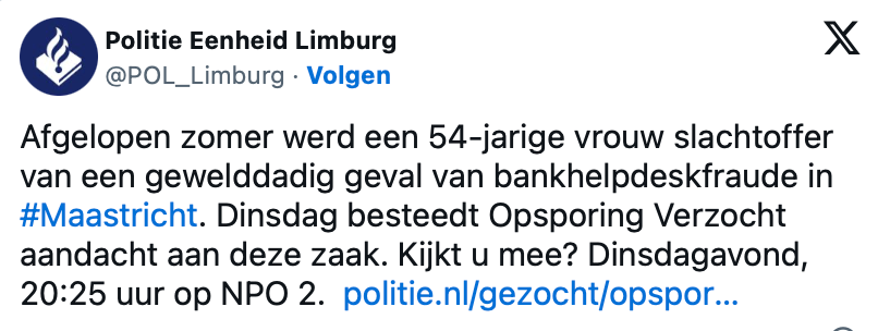 Het tv-programma Opsporing Verzocht dinsdagavond aandacht aan een Maastrichtse zaak. De politie is vastbesloten om een man te pakken te krijgen die een 54-jarige vrouw een pinpas van haar bank en de juiste code onder bedreiging van een mes afhandig maakte.