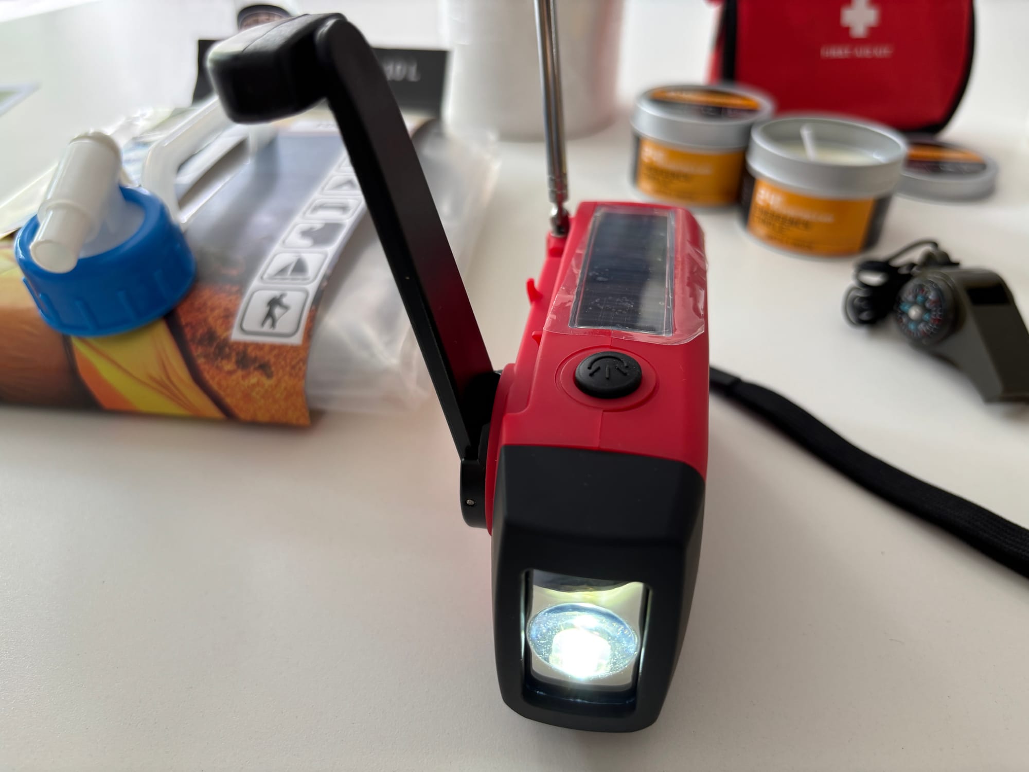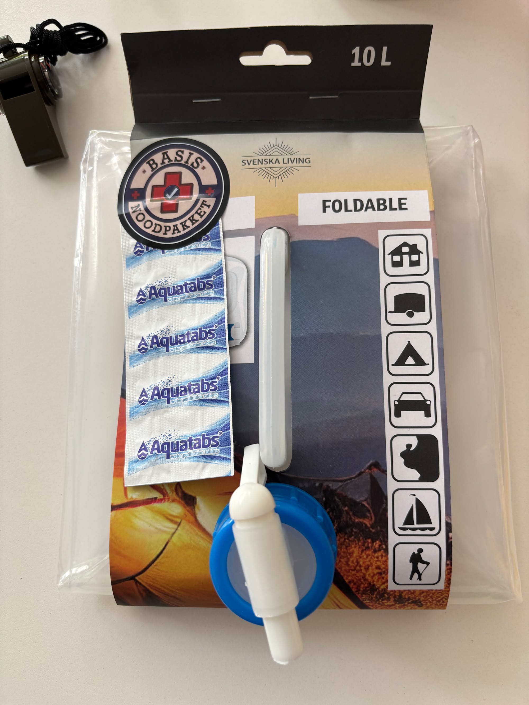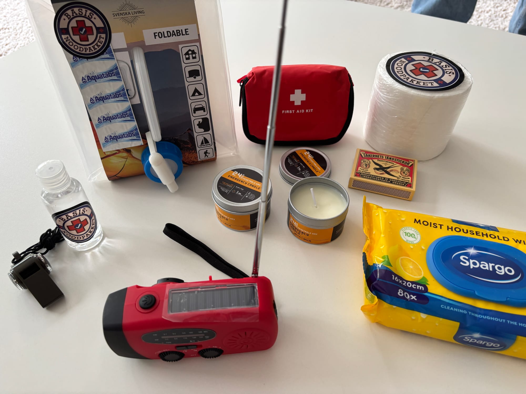 De gedachte achter het pakket is dat er thuis drie dagen mee kunt overleven. "Wat heb je nodig als de stroom uitvalt, je geen stromend water meer hebt en ook internet eruit ligt? We hebben bijvoorbeeld twee kaarsen die 24 uur per stuk branden. Genoeg voor twee dagen, want je zult ook slapen. Er is een noodradio, handopwindbaar, die tevens dienst kan doen als powerbank. Er is een opvouwbare jerrycan van 10 liter met een aantal waterzuiveringstabletten. Er is een fluitje, voor als je onder het puin zou liggen. Hygiënespullen. En zo zit de hele doos die je thuis in een kast kunt zetten, vol met bruikbare artikelen.