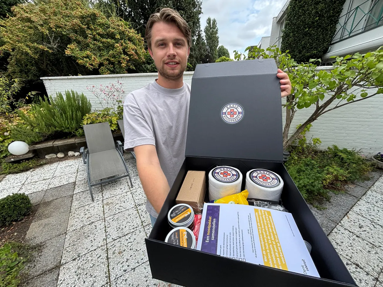 Het ondernemen zit Giscard Hamers (26) in het bloed. Hij is met twee vrienden het bedrijf Basisnoodpakket.com begonnen. "We zagen dat de overheid noodpakketten adviseert. Thuis zag ik dat mam jodiumpillen kocht en toch wat water insloeg. Dat zette me aan het denken. De bestaande pakketten werden aangeboden voor meestal tussen de 100 en 150 euro. Bij ons kost een goed geselecteerd, getest en compleet pakket 60 euro, inclusief verzendkosten van de doos."